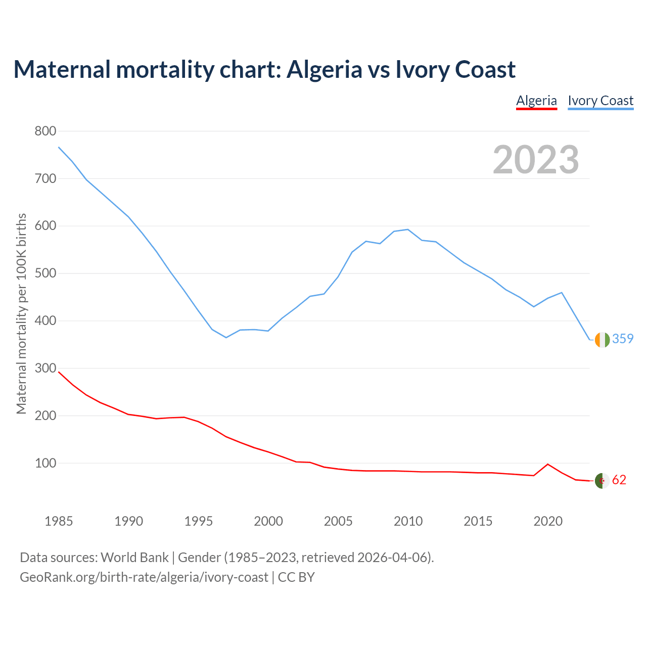 The maternal mortality rate, which is the probability of dying during childbirth or within 42 days of pregnancy termination, is 62 deaths per 100,000 live births in Algeria, compared to 359 deaths in Ivory Coast.