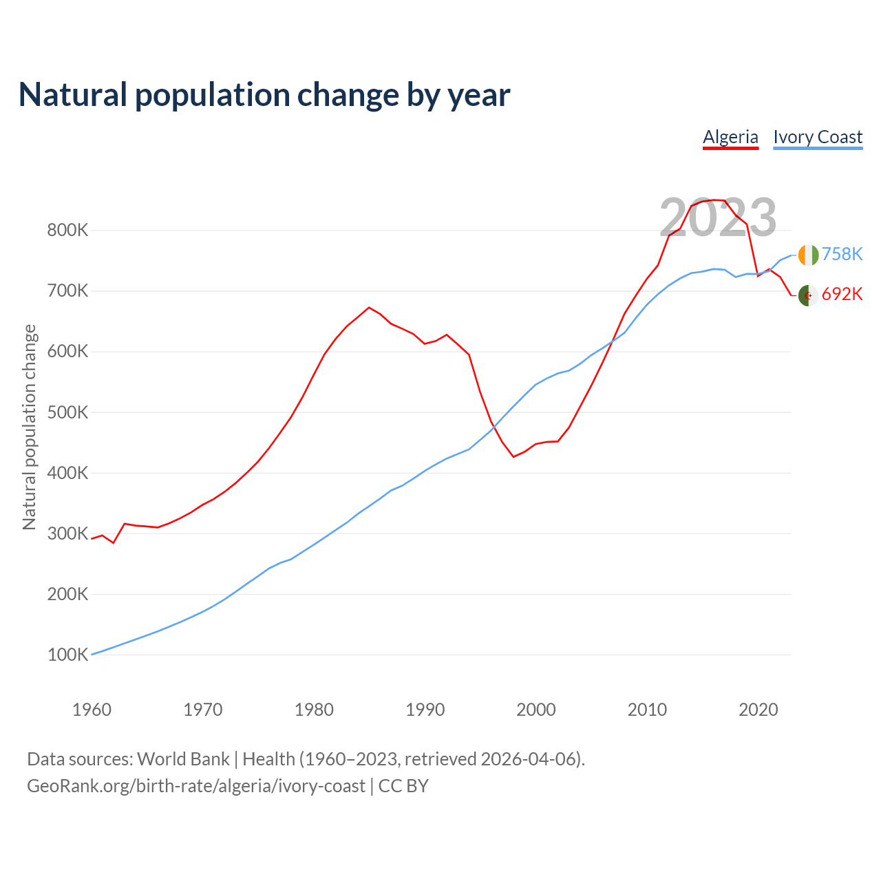 Algeria has an annual birth rate of 19.6 births per 1,000 people, compared to 32 for Ivory Coast. The average number of children a woman is expected to have during her lifetime — the fertility rate, is 2.77 in Algeria and 4.28 in Ivory Coast — 54.8% difference.