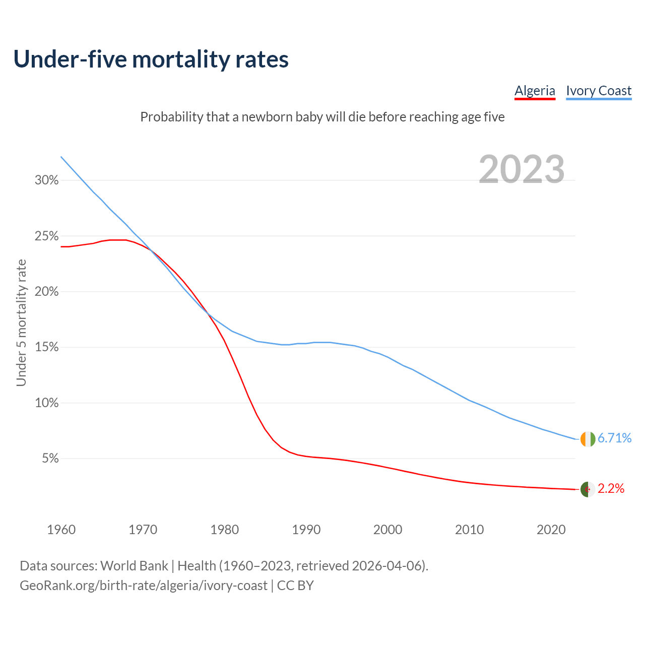 The chance that a newborn baby will die before reaching age five is 2.2% in Algeria and 6.71% in Ivory Coast. Above is a chart with historical data on under-five mortality rates.