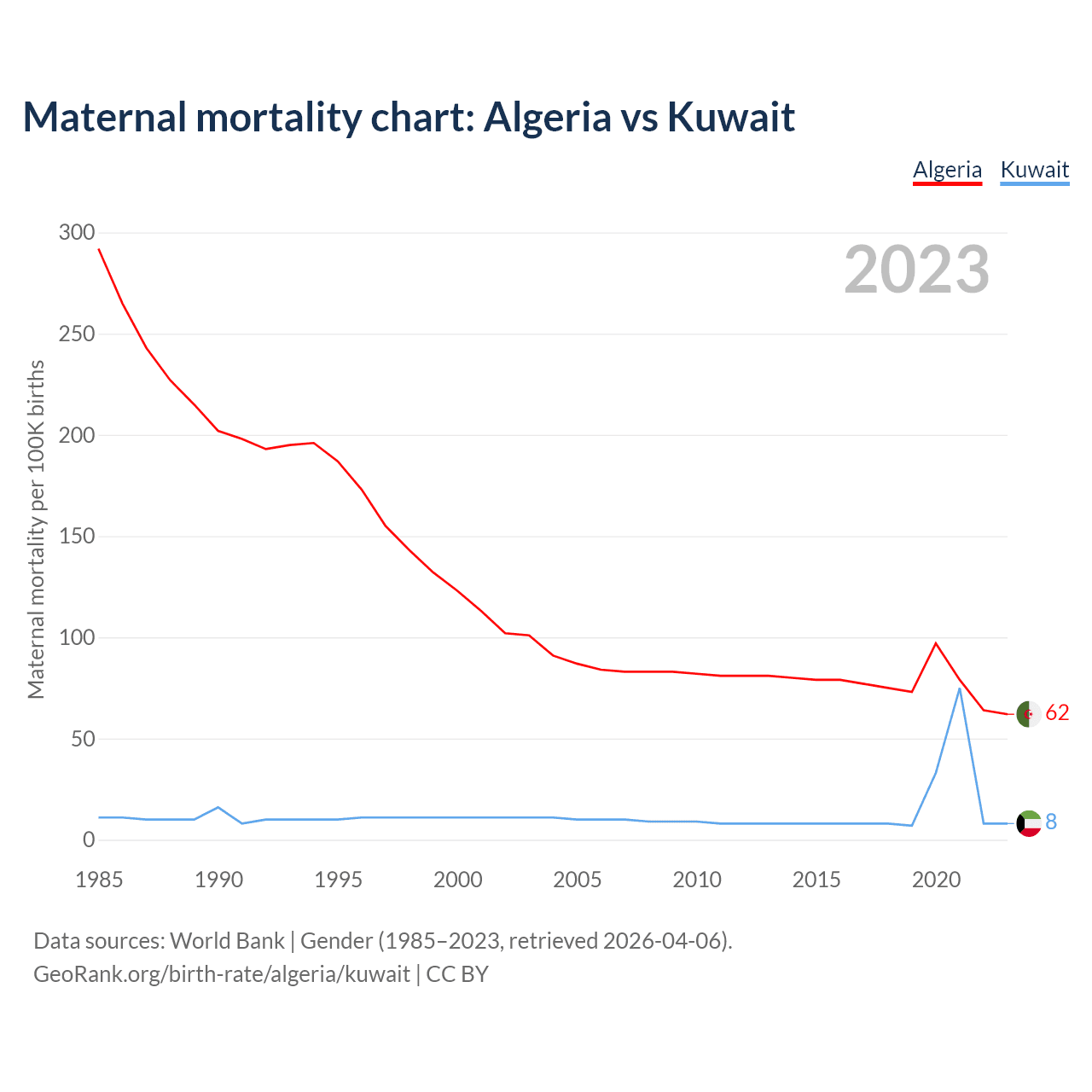 The maternal mortality rate, which is the probability of dying during childbirth or within 42 days of pregnancy termination, is 62 deaths per 100,000 live births in Algeria, compared to 8 deaths in Kuwait.