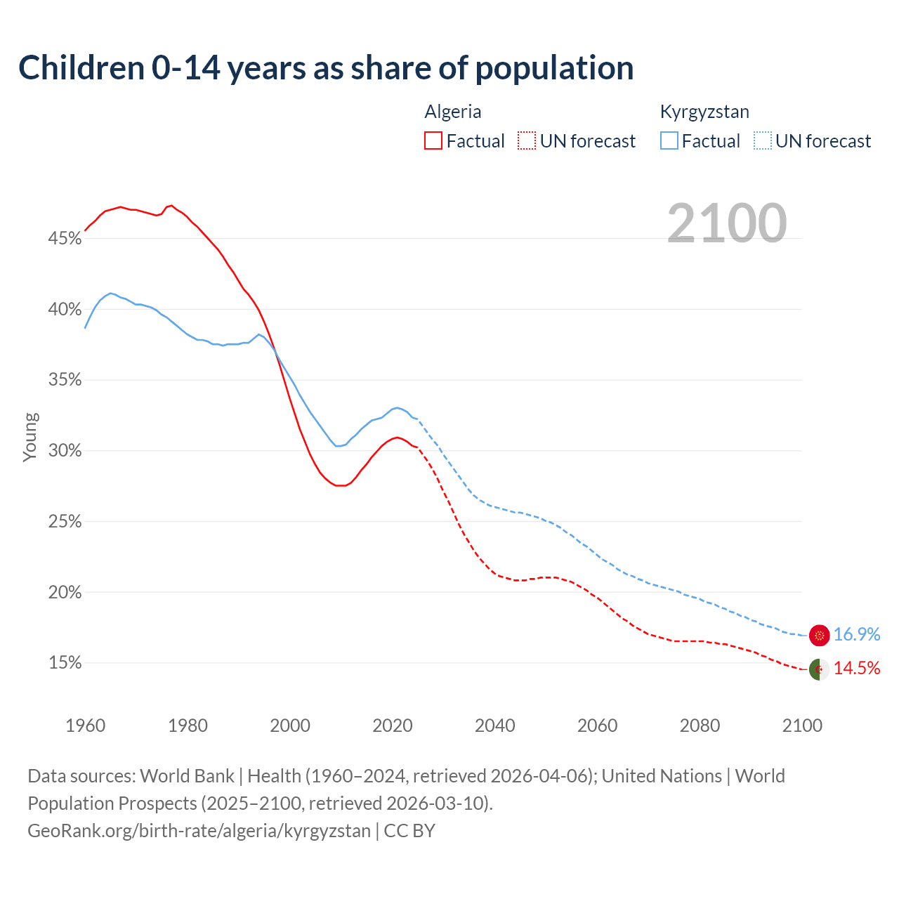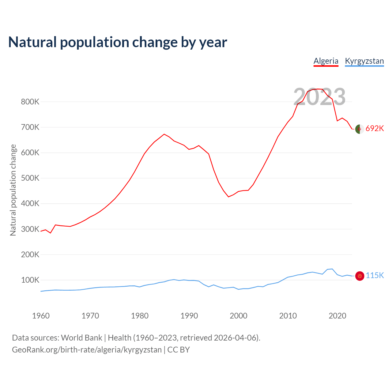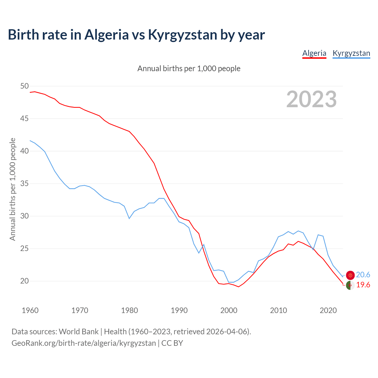 Algeria has an annual birth rate of 19.6 births per 1,000 people, compared to 20.6 for Kyrgyzstan. The average number of children a woman is expected to have during her lifetime — the fertility rate, is 2.77 in Algeria and 2.7 in Kyrgyzstan — 2.39% difference.
