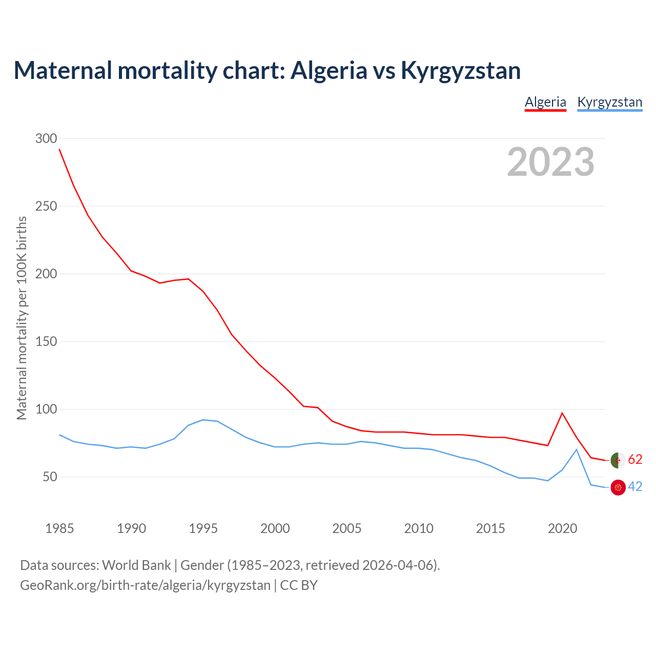 The maternal mortality rate, which is the probability of dying during childbirth or within 42 days of pregnancy termination, is 62 deaths per 100,000 live births in Algeria, compared to 42 deaths in Kyrgyzstan.