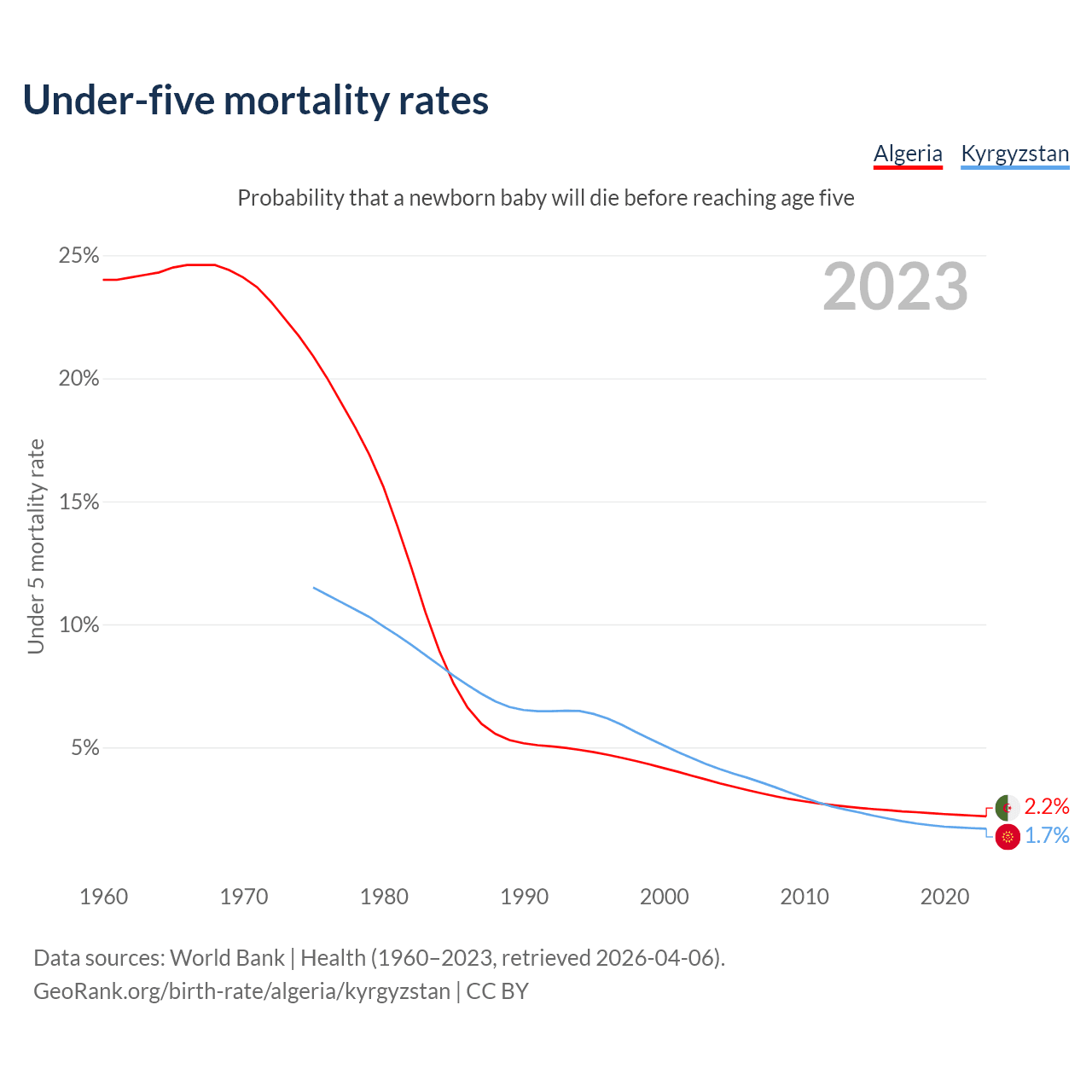 The chance that a newborn baby will die before reaching age five is 2.2% in Algeria and 1.7% in Kyrgyzstan. Above is a chart with historical data on under-five mortality rates.