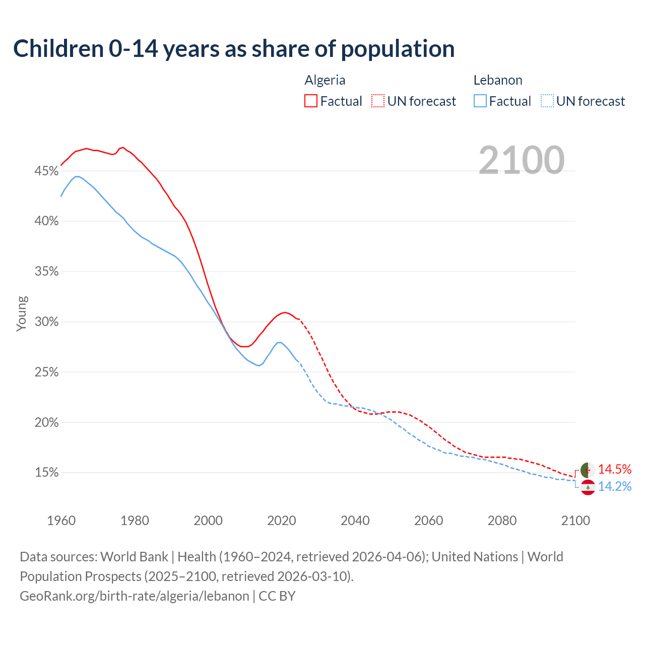 According to the latest available data on birth rates, the fertility rate in Algeria was 2.77 children per woman in 2023, compared to 2.24 in Lebanon in 2023. The replacement level is considered to be 2.1 children per woman.