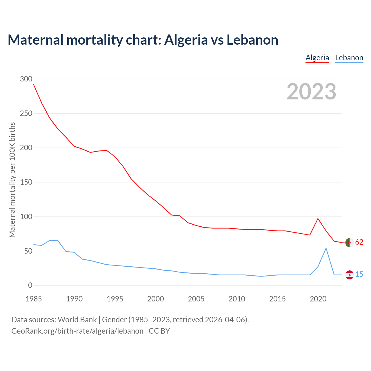 The maternal mortality rate, which is the probability of dying during childbirth or within 42 days of pregnancy termination, is 62 deaths per 100,000 live births in Algeria, compared to 15 deaths in Lebanon.