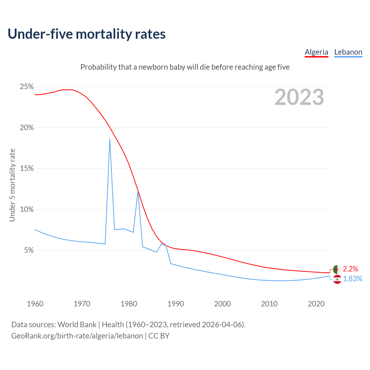 The chance that a newborn baby will die before reaching age five is 2.2% in Algeria and 1.83% in Lebanon. Above is a chart with historical data on under-five mortality rates.