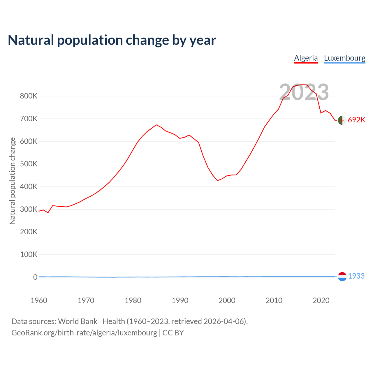 Algeria has an annual birth rate of 19.6 births per 1,000 people, compared to 9.5 for Luxembourg. The average number of children a woman is expected to have during her lifetime — the fertility rate, is 2.77 in Algeria and 1.25 in Luxembourg — 54.8% difference.