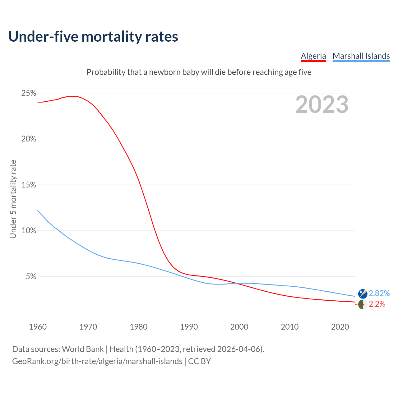 The chance that a newborn baby will die before reaching age five is 2.2% in Algeria and 2.82% in the Marshall Islands. Above is a chart with historical data on under-five mortality rates.
