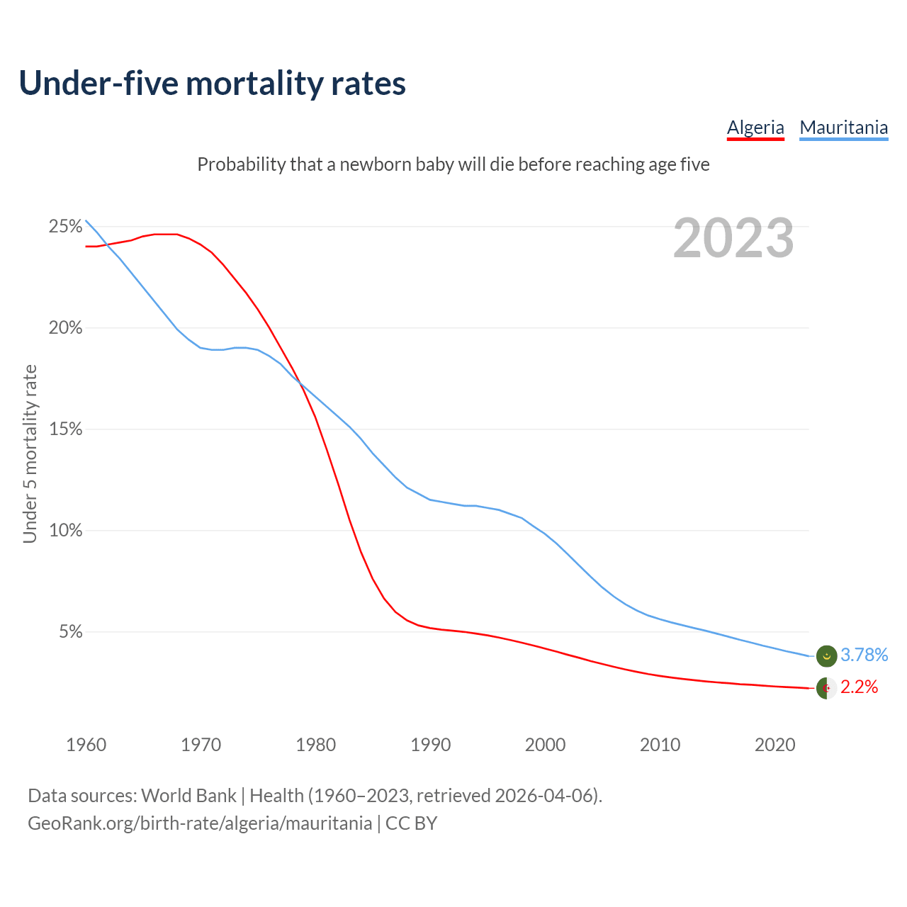 The chance that a newborn baby will die before reaching age five is 2.2% in Algeria and 3.78% in Mauritania. Above is a chart with historical data on under-five mortality rates.