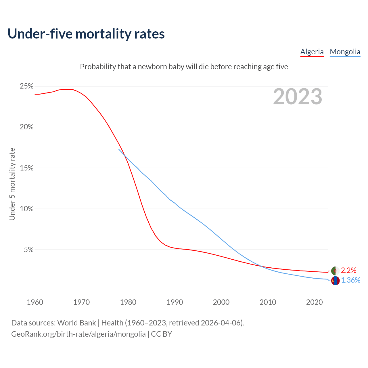 The chance that a newborn baby will die before reaching age five is 2.2% in Algeria and 1.36% in Mongolia. Above is a chart with historical data on under-five mortality rates.