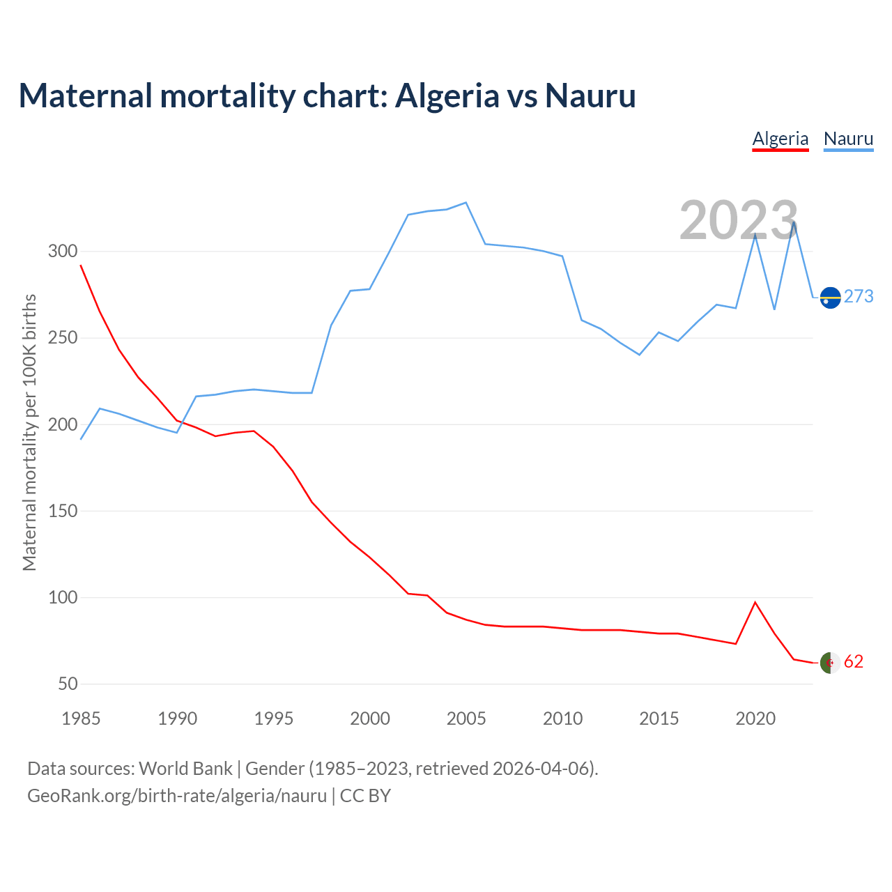 The maternal mortality rate, which is the probability of dying during childbirth or within 42 days of pregnancy termination, is 62 deaths per 100,000 live births in Algeria, compared to 273 deaths in Nauru.