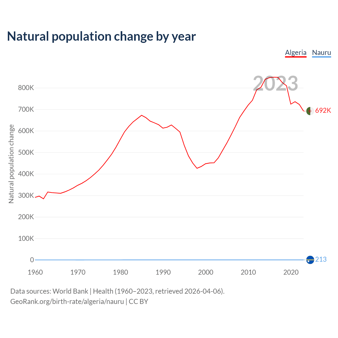 According to the latest available data on birth rates, the fertility rate in Algeria was 2.77 children per woman in 2023, compared to 3.33 in Nauru in 2023. The replacement level is considered to be 2.1 children per woman.