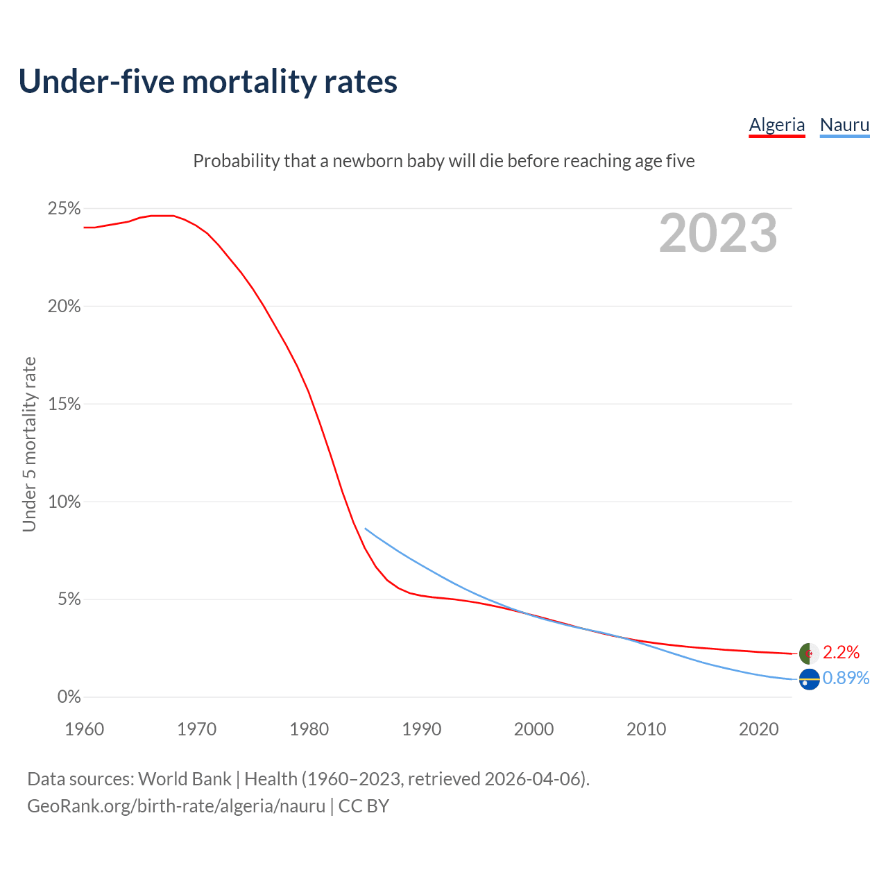 The chance that a newborn baby will die before reaching age five is 2.2% in Algeria and 0.89% in Nauru. Above is a chart with historical data on under-five mortality rates.