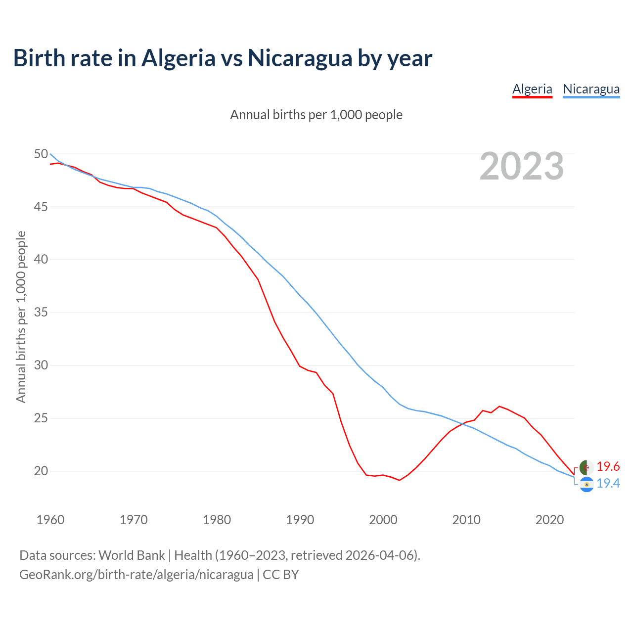 Algeria has an annual birth rate of 19.6 births per 1,000 people, compared to 19.4 for Nicaragua. The average number of children a woman is expected to have during her lifetime — the fertility rate, is 2.77 in Algeria and 2.22 in Nicaragua — 19.8% difference.