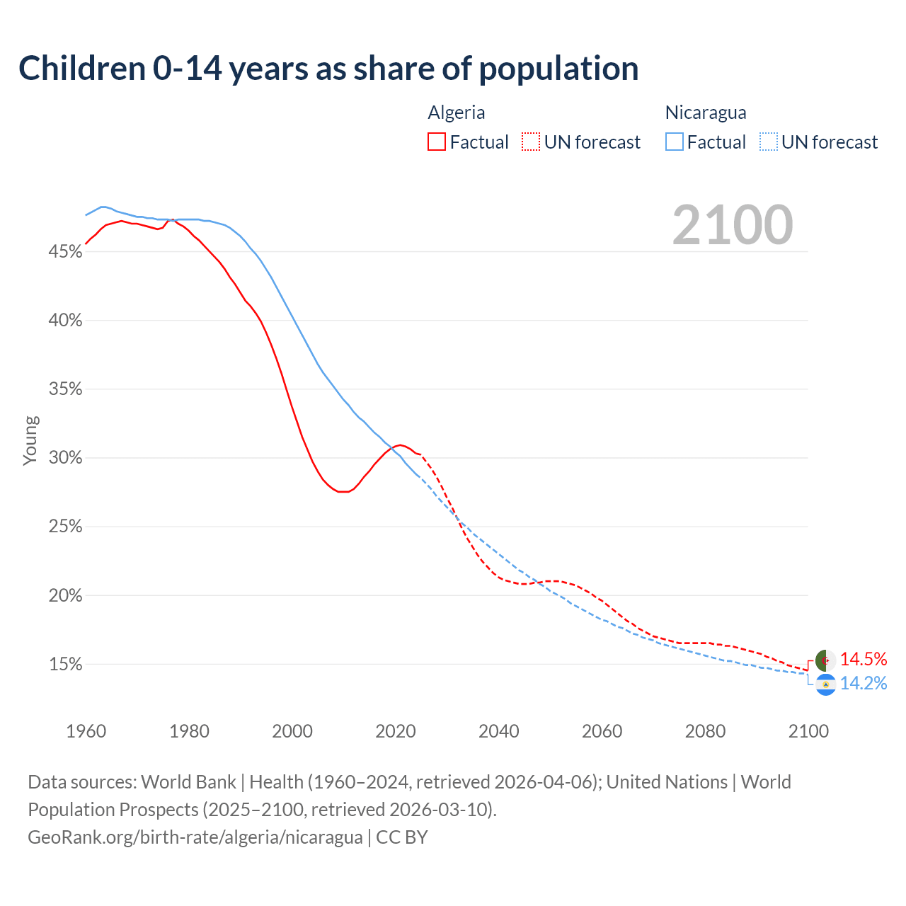 According to the latest available data on birth rates, the fertility rate in Algeria was 2.77 children per woman in 2023, compared to 2.22 in Nicaragua in 2023. The replacement level is considered to be 2.1 children per woman.