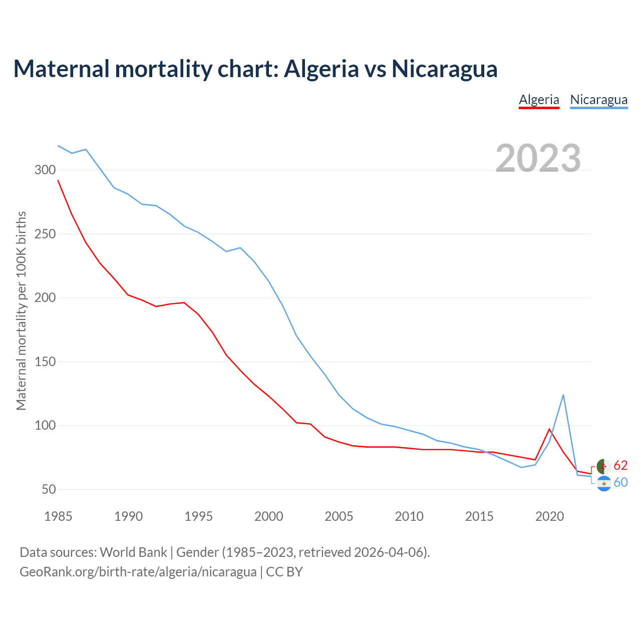 The maternal mortality rate, which is the probability of dying during childbirth or within 42 days of pregnancy termination, is 62 deaths per 100,000 live births in Algeria, compared to 60 deaths in Nicaragua.