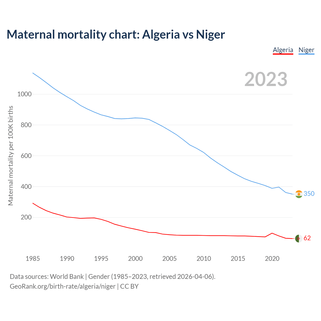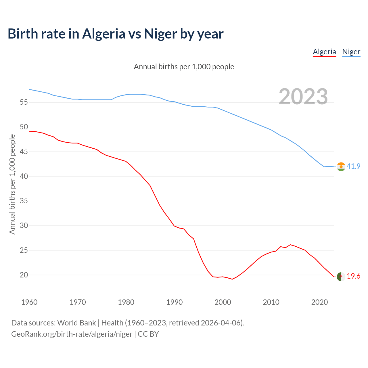 Algeria has an annual birth rate of 19.6 births per 1,000 people, compared to 41.9 for Niger. The average number of children a woman is expected to have during her lifetime — the fertility rate, is 2.77 in Algeria and 6.06 in Niger — 119.1% difference.