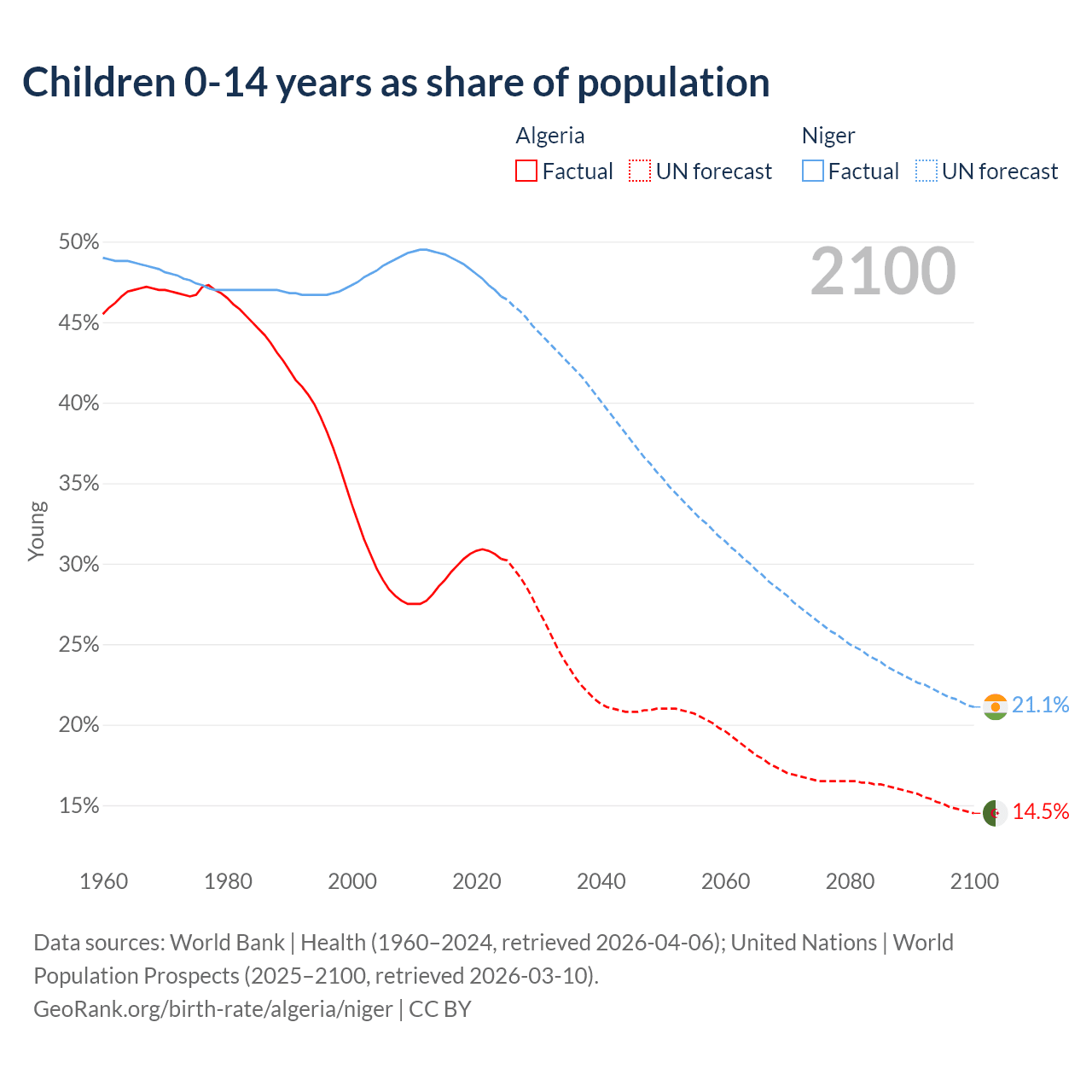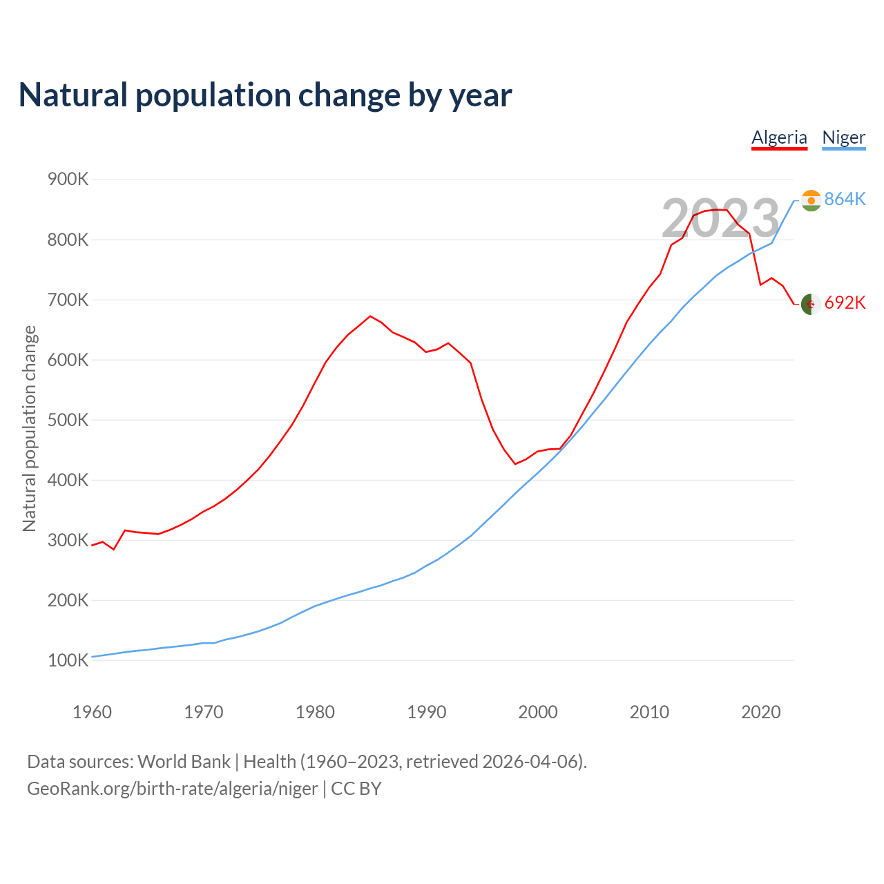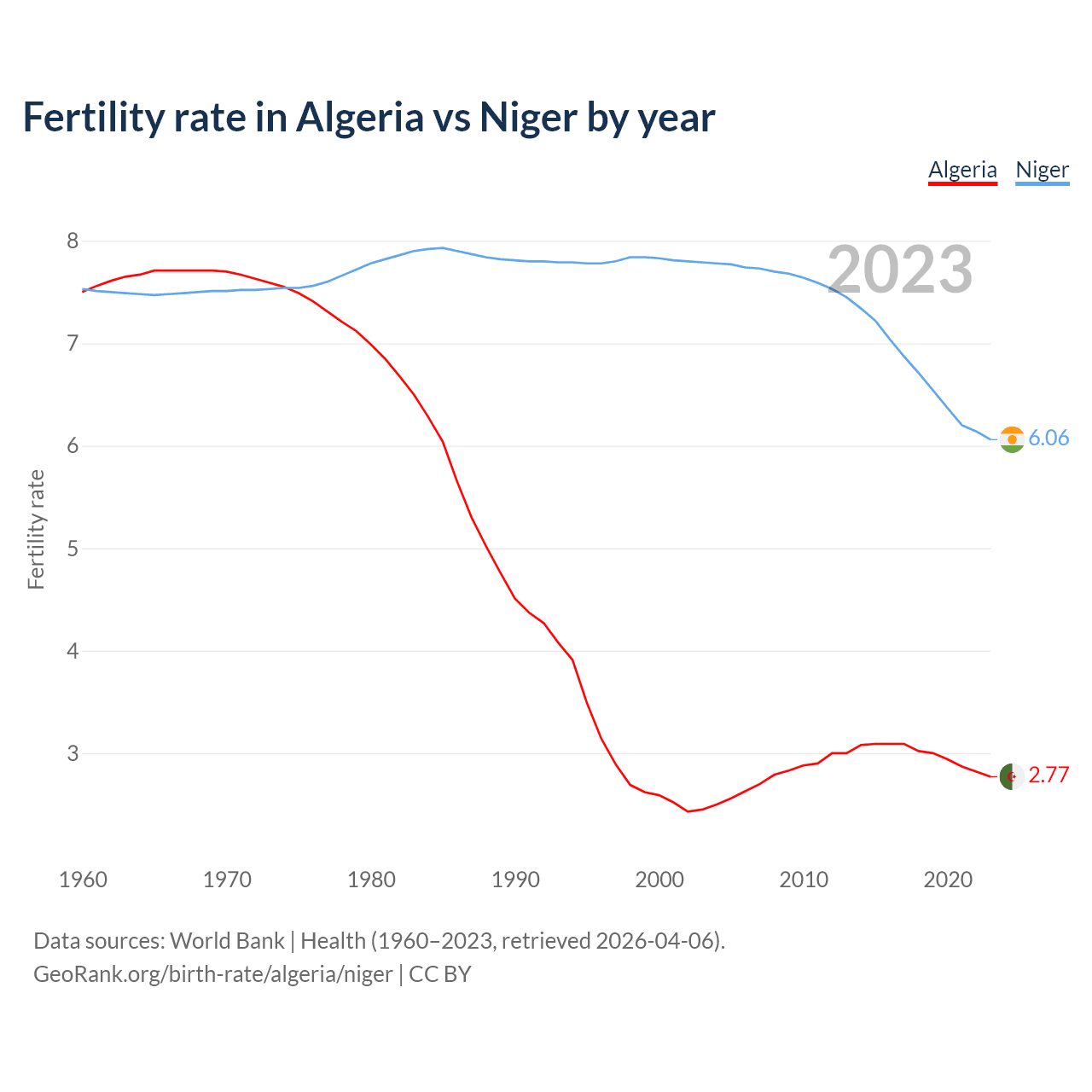 According to the latest available data on birth rates, the fertility rate in Algeria was 2.77 children per woman in 2023, compared to 6.06 in Niger in 2023. The replacement level is considered to be 2.1 children per woman.