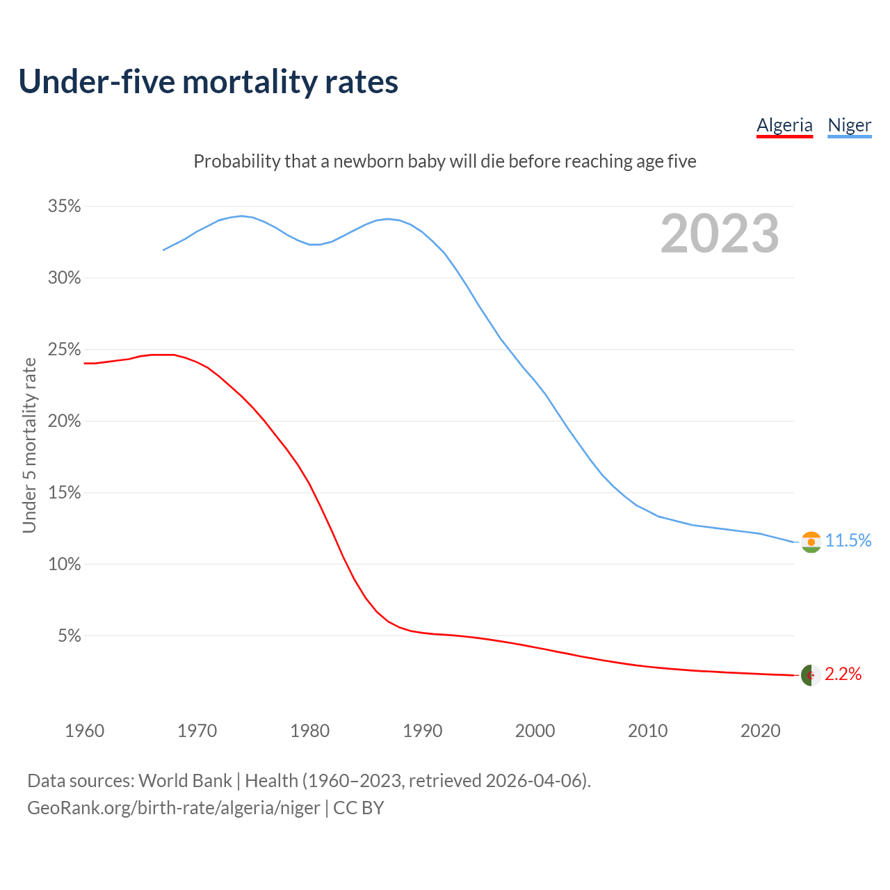 The chance that a newborn baby will die before reaching age five is 2.2% in Algeria and 11.5% in Niger. Above is a chart with historical data on under-five mortality rates.