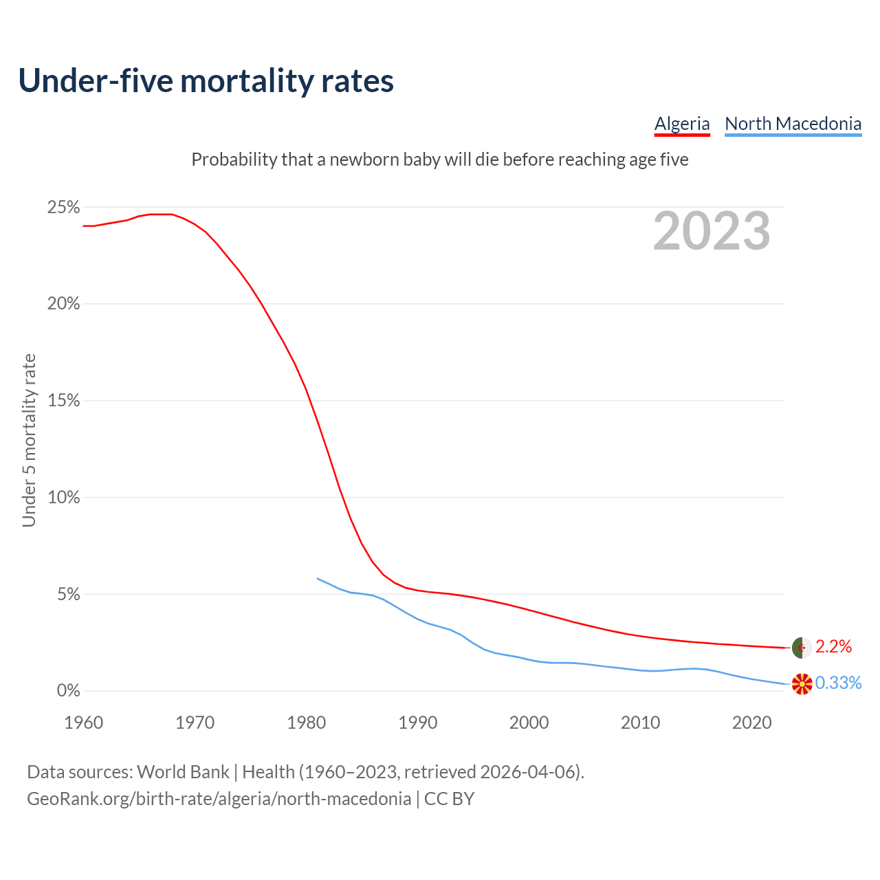 The chance that a newborn baby will die before reaching age five is 2.2% in Algeria and 0.33% in North Macedonia. Above is a chart with historical data on under-five mortality rates.