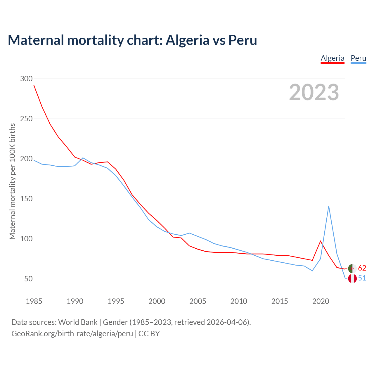 The maternal mortality rate, which is the probability of dying during childbirth or within 42 days of pregnancy termination, is 62 deaths per 100,000 live births in Algeria, compared to 51 deaths in Peru.