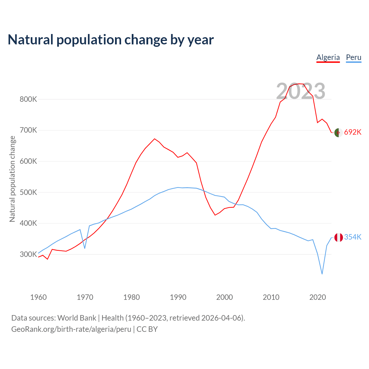 According to the latest available data on birth rates, the fertility rate in Algeria was 2.77 children per woman in 2023, compared to 1.98 in Peru in 2023. The replacement level is considered to be 2.1 children per woman.