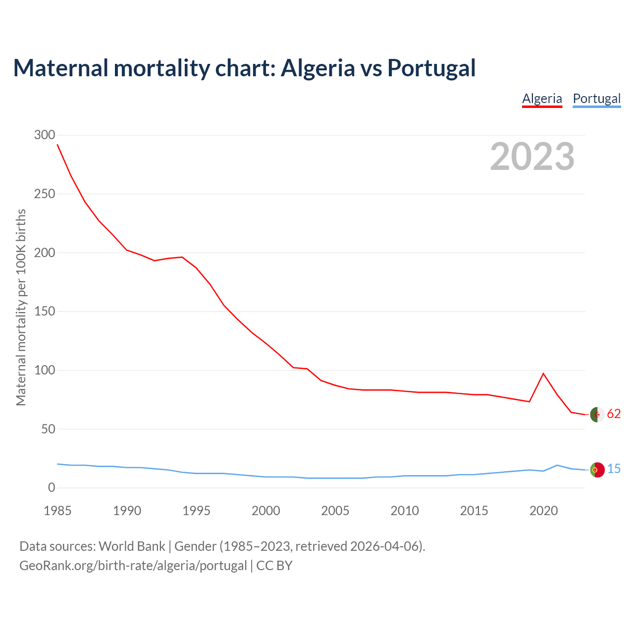The maternal mortality rate, which is the probability of dying during childbirth or within 42 days of pregnancy termination, is 62 deaths per 100,000 live births in Algeria, compared to 15 deaths in Portugal.