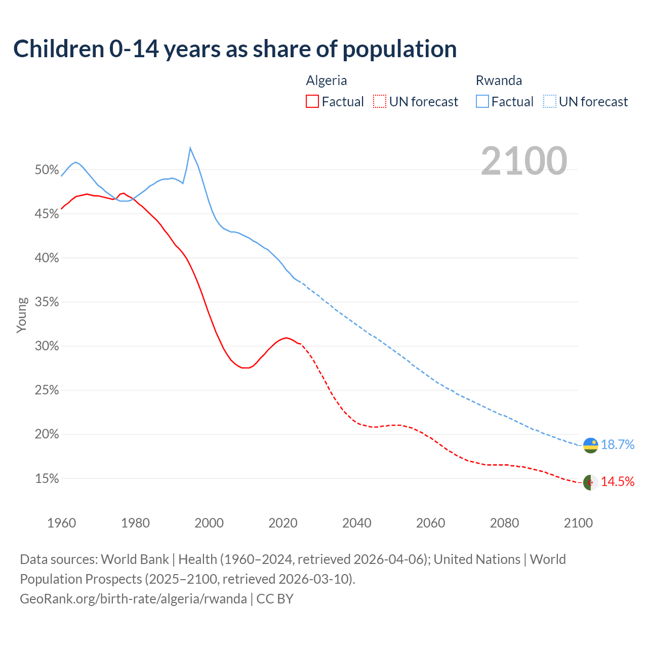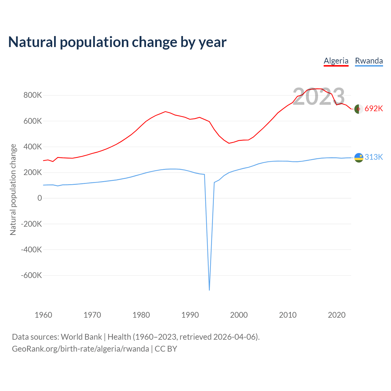 Algeria has an annual birth rate of 19.6 births per 1,000 people, compared to 28.3 for Rwanda. The average number of children a woman is expected to have during her lifetime — the fertility rate, is 2.77 in Algeria and 3.7 in Rwanda — 33.7% difference.