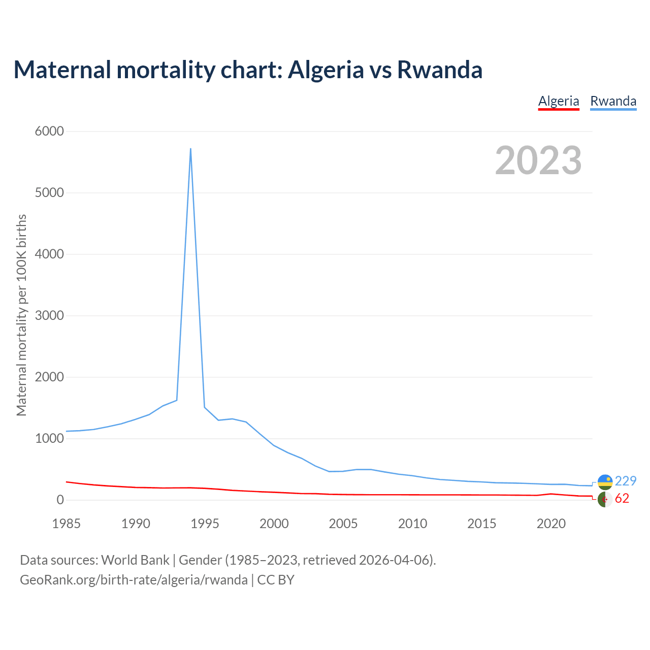 The maternal mortality rate, which is the probability of dying during childbirth or within 42 days of pregnancy termination, is 62 deaths per 100,000 live births in Algeria, compared to 229 deaths in Rwanda.