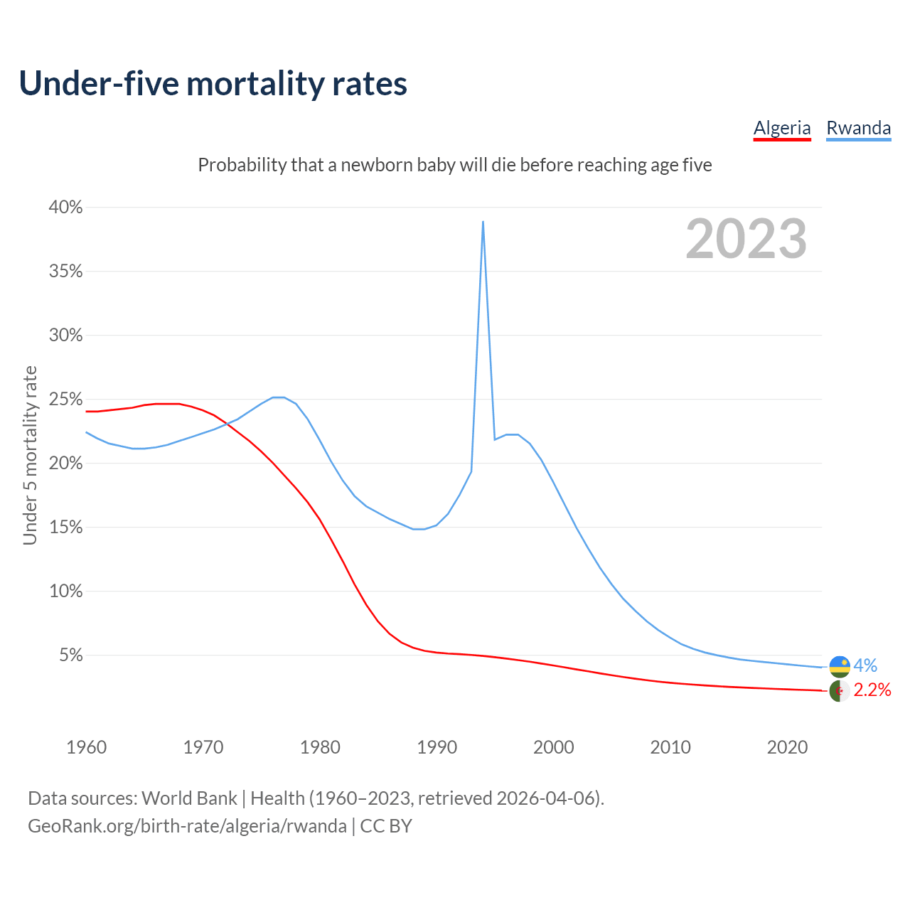 The chance that a newborn baby will die before reaching age five is 2.2% in Algeria and 4% in Rwanda. Above is a chart with historical data on under-five mortality rates.