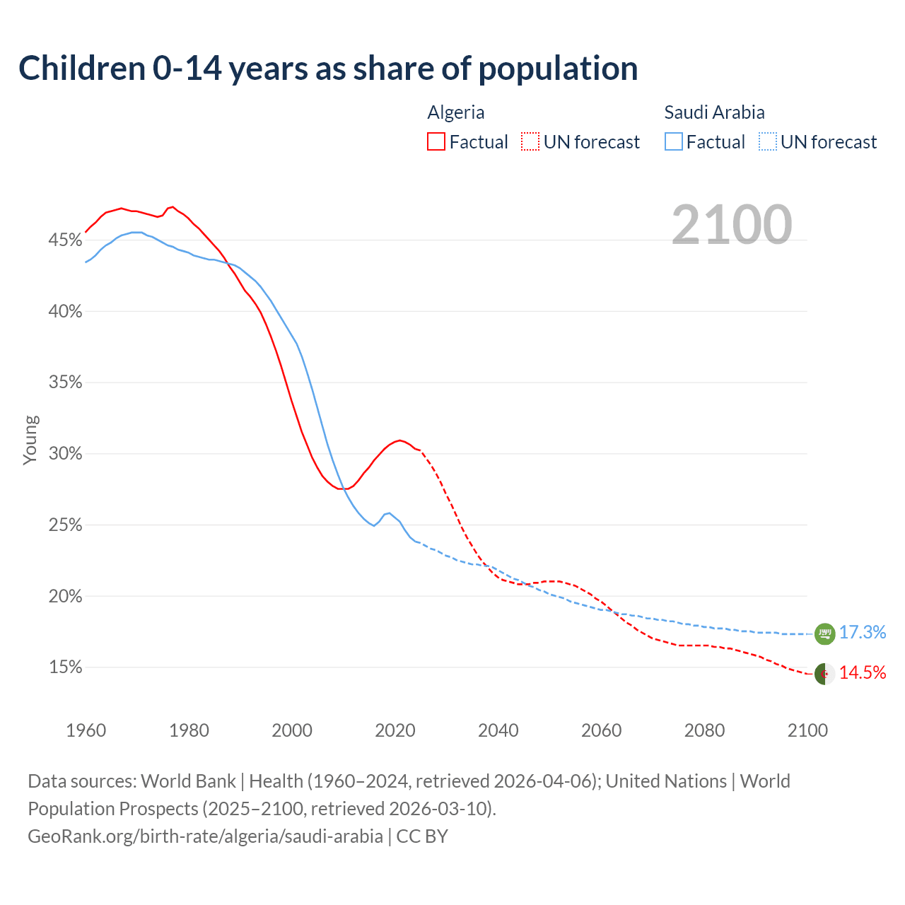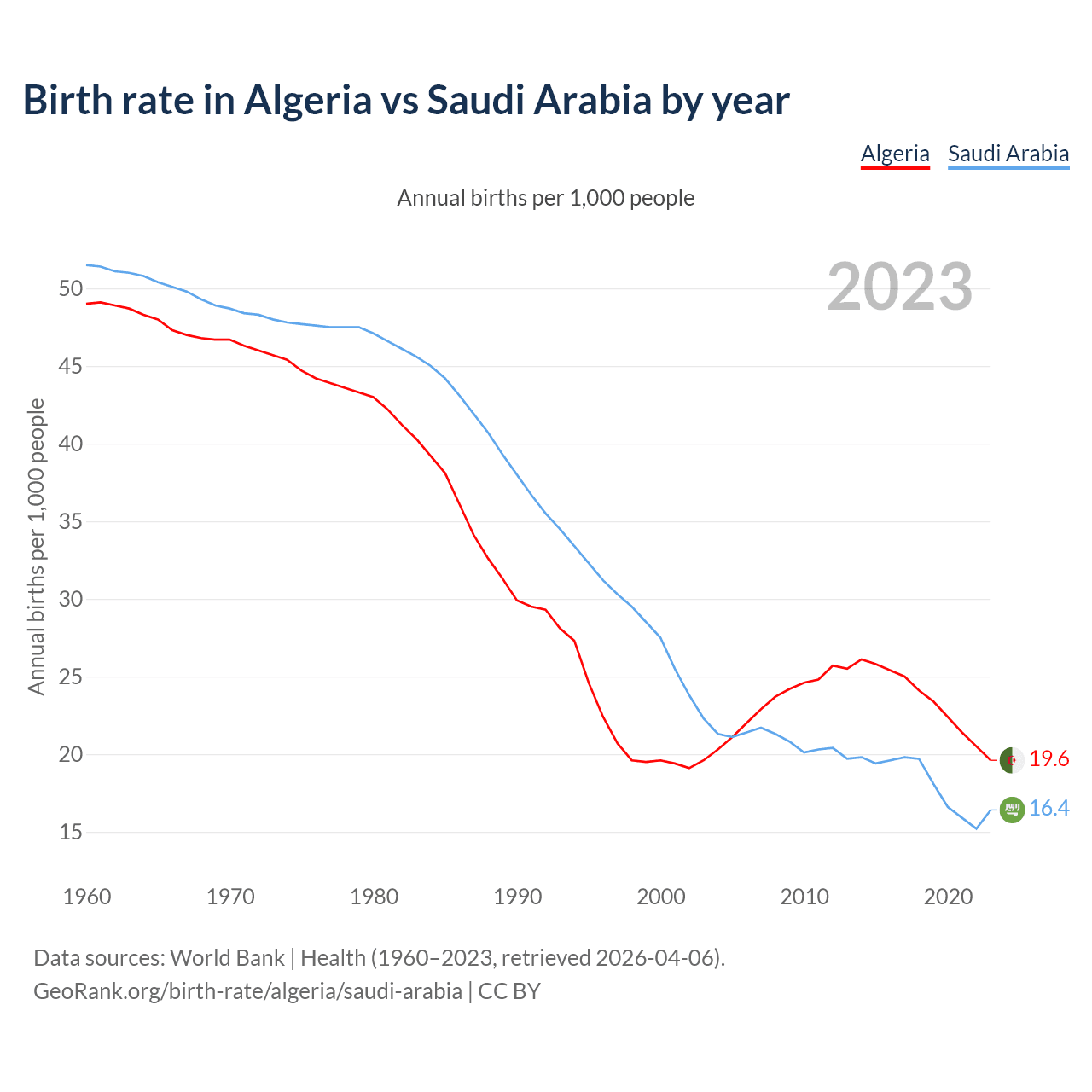 Algeria has an annual birth rate of 19.6 births per 1,000 people, compared to 16.4 for Saudi Arabia. The average number of children a woman is expected to have during her lifetime — the fertility rate, is 2.77 in Algeria and 2.28 in Saudi Arabia — 17.6% difference.