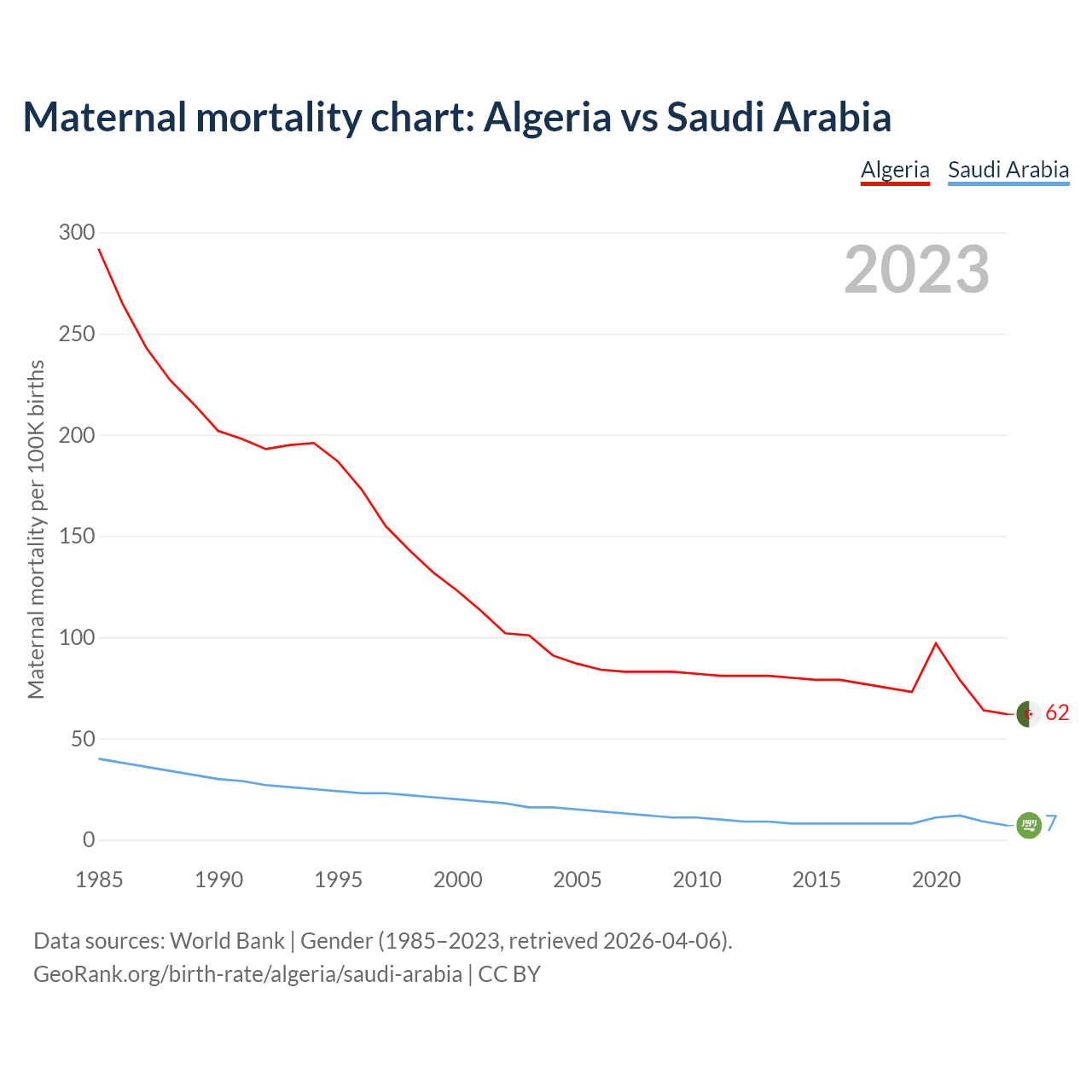 The maternal mortality rate, which is the probability of dying during childbirth or within 42 days of pregnancy termination, is 62 deaths per 100,000 live births in Algeria, compared to 7 deaths in Saudi Arabia.