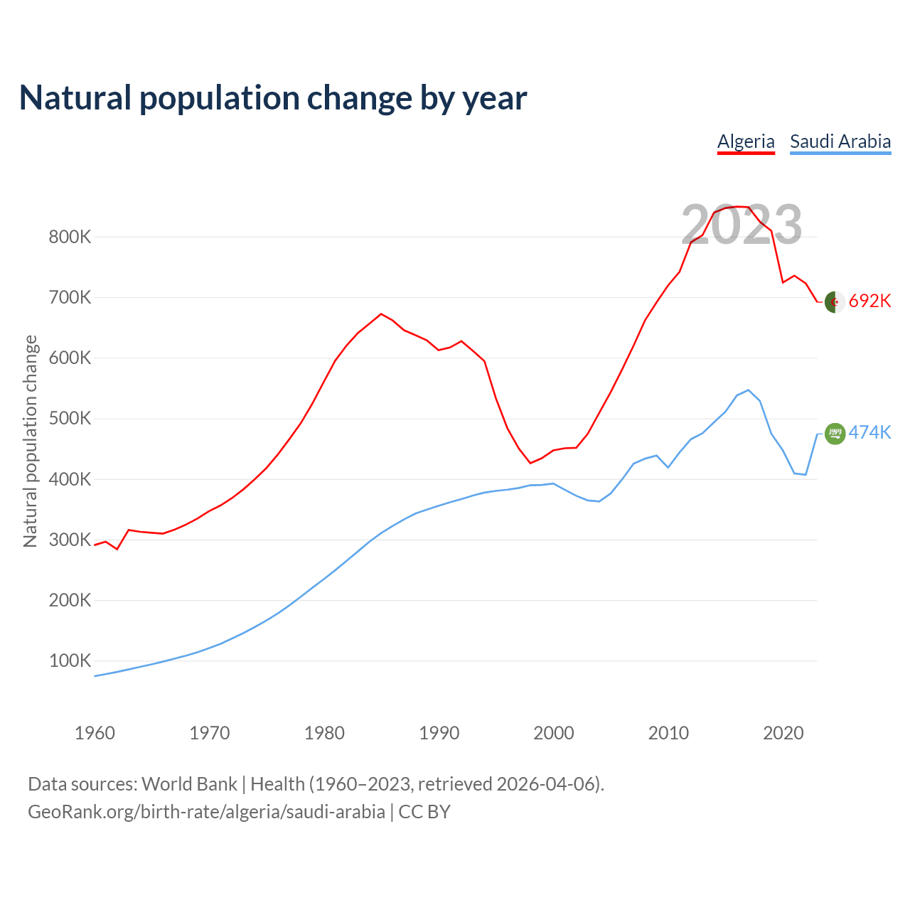 According to the latest available data on birth rates, the fertility rate in Algeria was 2.77 children per woman in 2023, compared to 2.28 in Saudi Arabia in 2023. The replacement level is considered to be 2.1 children per woman.