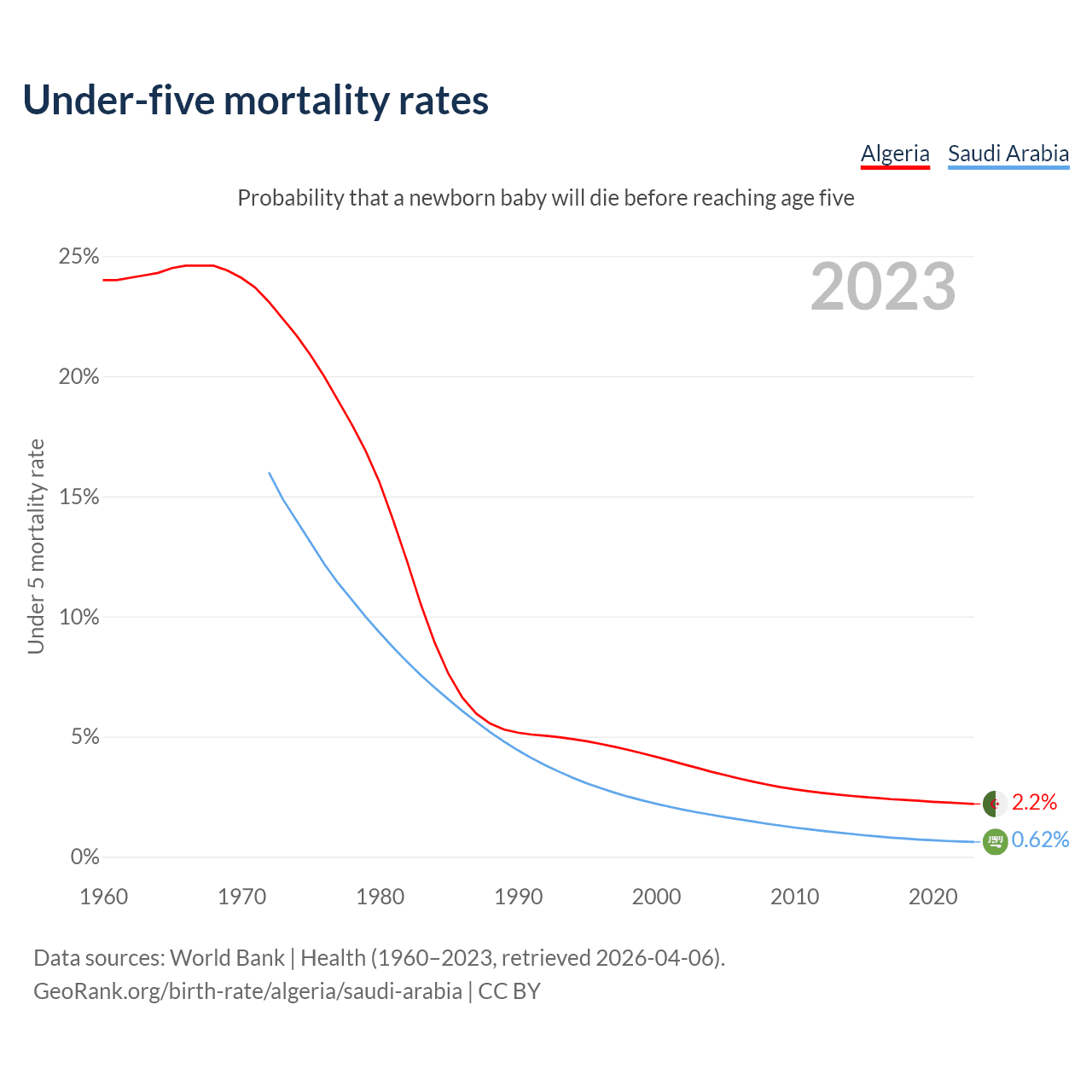 The chance that a newborn baby will die before reaching age five is 2.2% in Algeria and 0.62% in Saudi Arabia. Above is a chart with historical data on under-five mortality rates.
