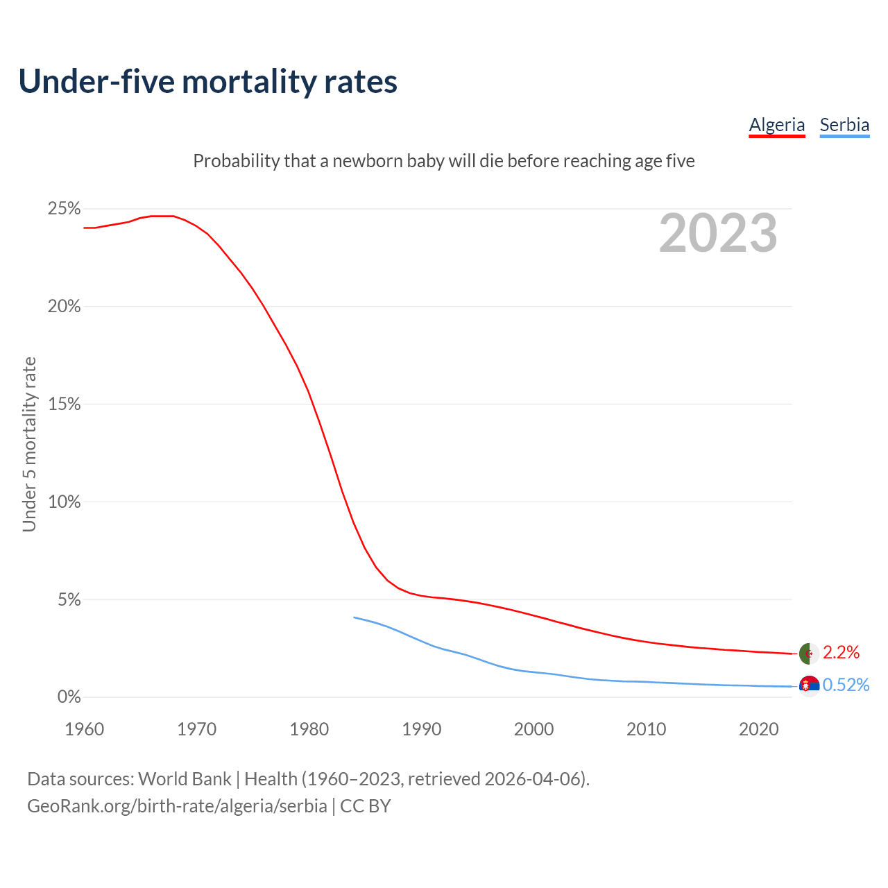The chance that a newborn baby will die before reaching age five is 2.2% in Algeria and 0.52% in Serbia. Above is a chart with historical data on under-five mortality rates.