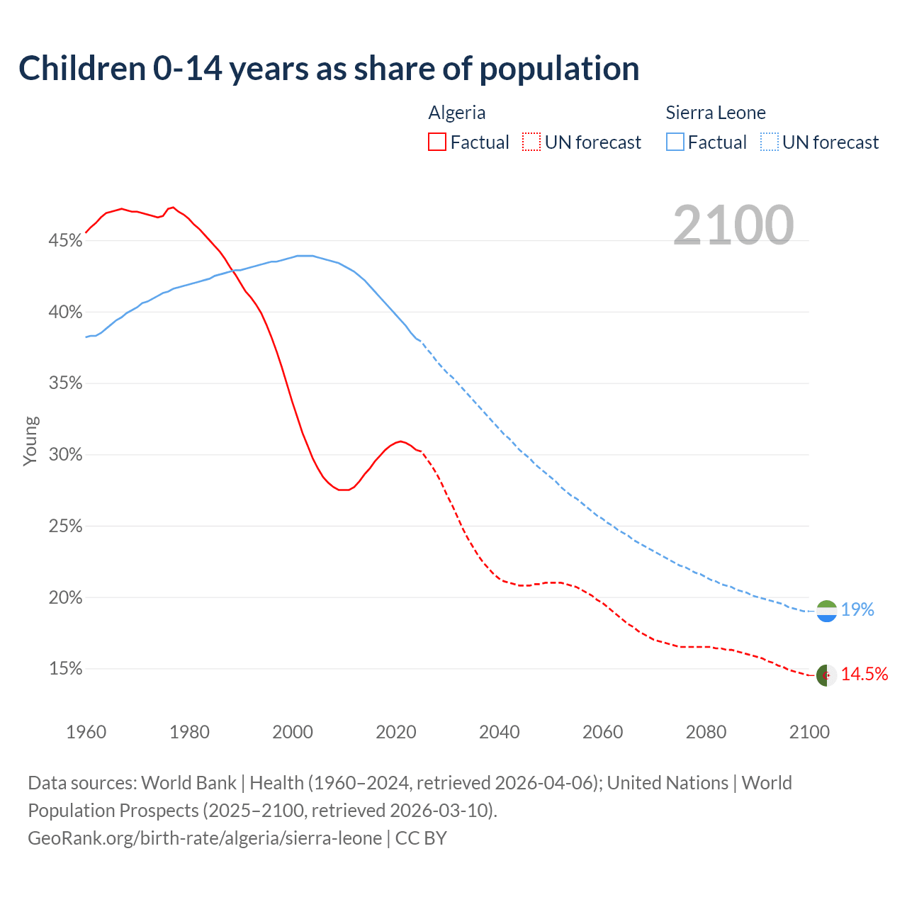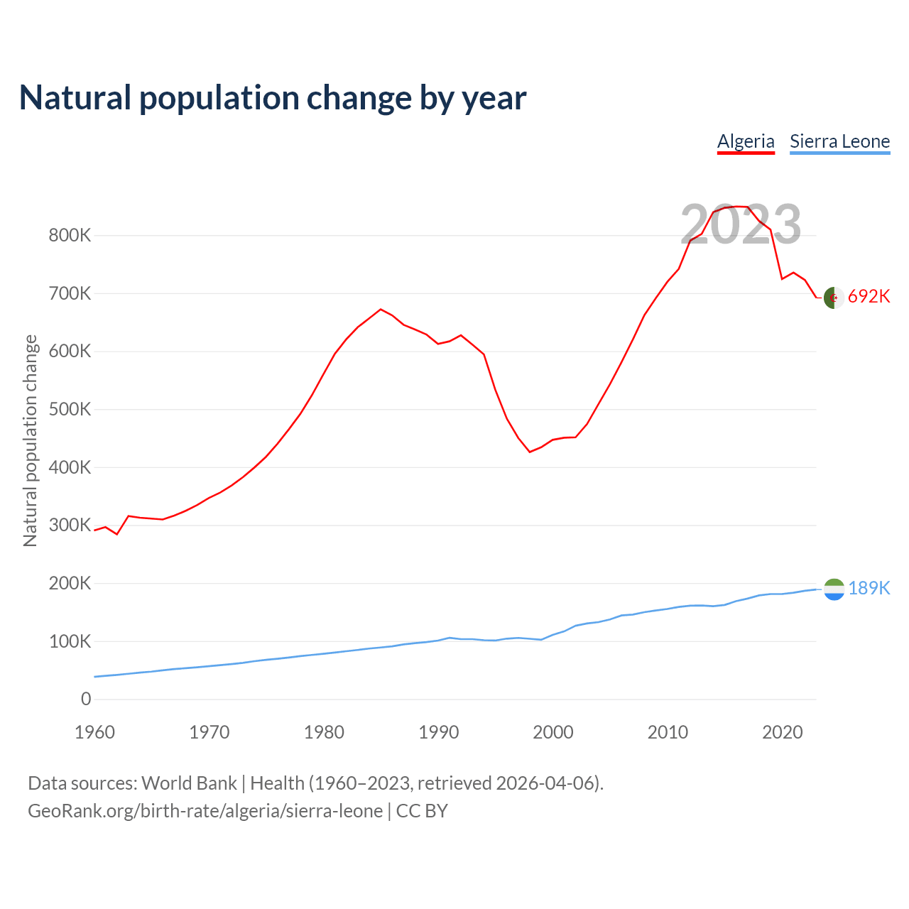 Algeria has an annual birth rate of 19.6 births per 1,000 people, compared to 30.6 for Sierra Leone. The average number of children a woman is expected to have during her lifetime — the fertility rate, is 2.77 in Algeria and 3.79 in Sierra Leone — 37.1% difference.