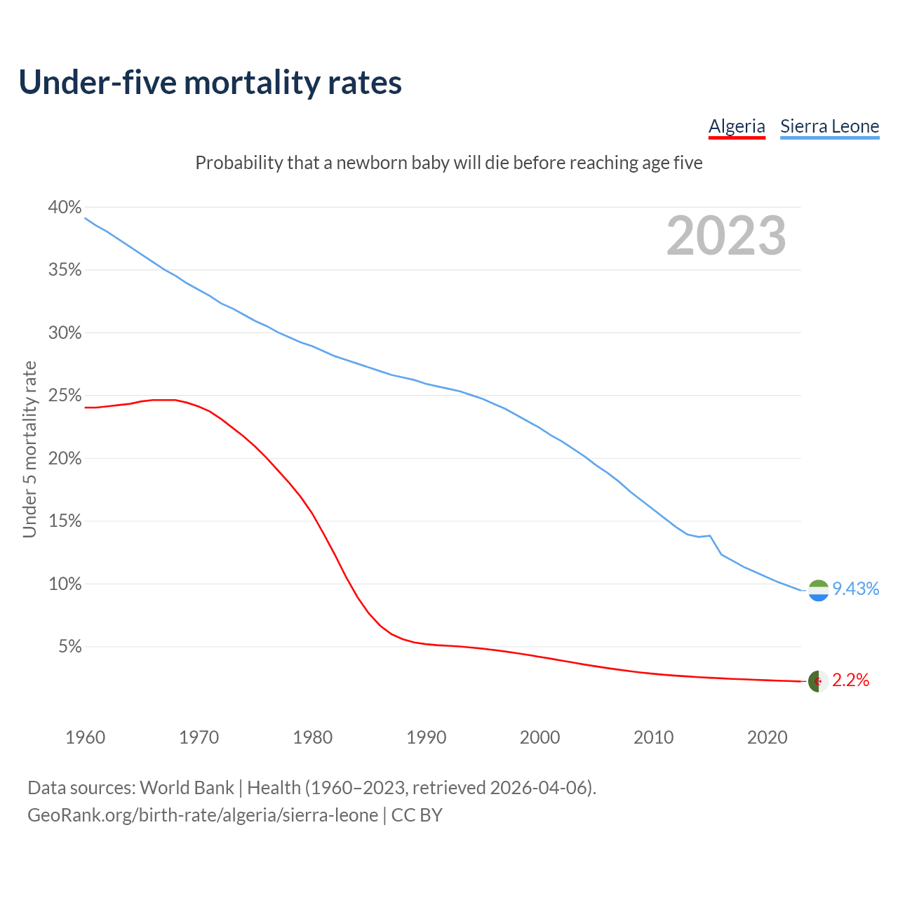 The chance that a newborn baby will die before reaching age five is 2.2% in Algeria and 9.43% in Sierra Leone. Above is a chart with historical data on under-five mortality rates.