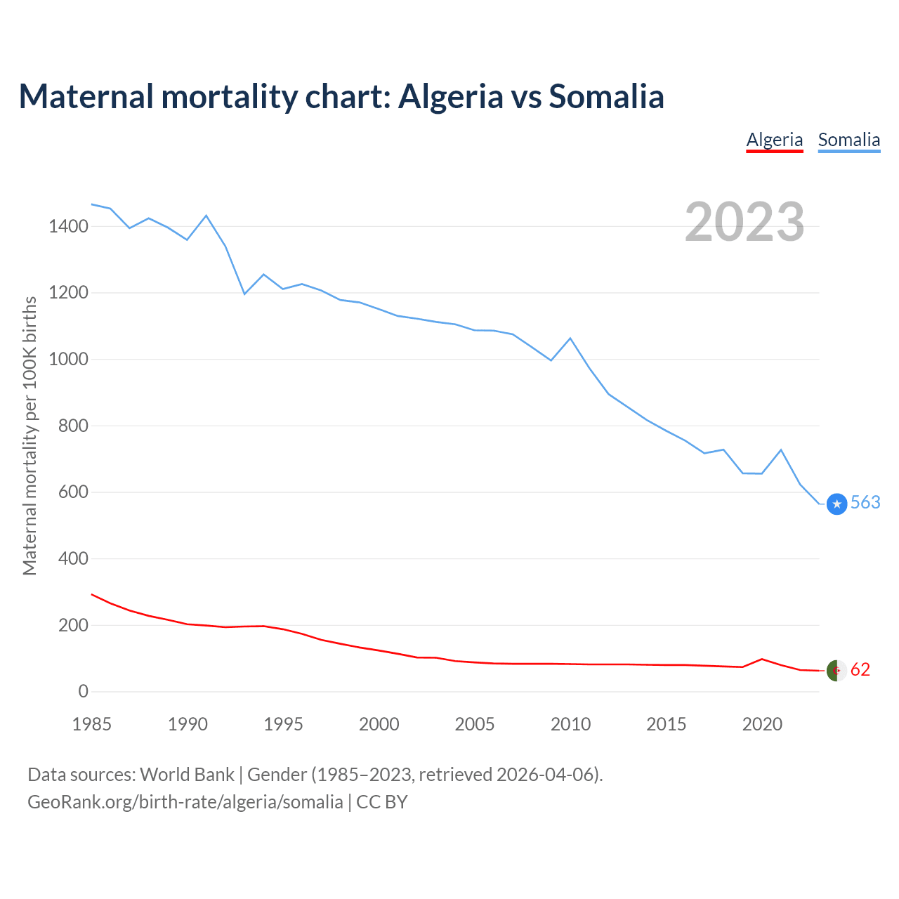 Data sources: World Bank | Gender (1985–2023, retrieved 2026-04-06).
