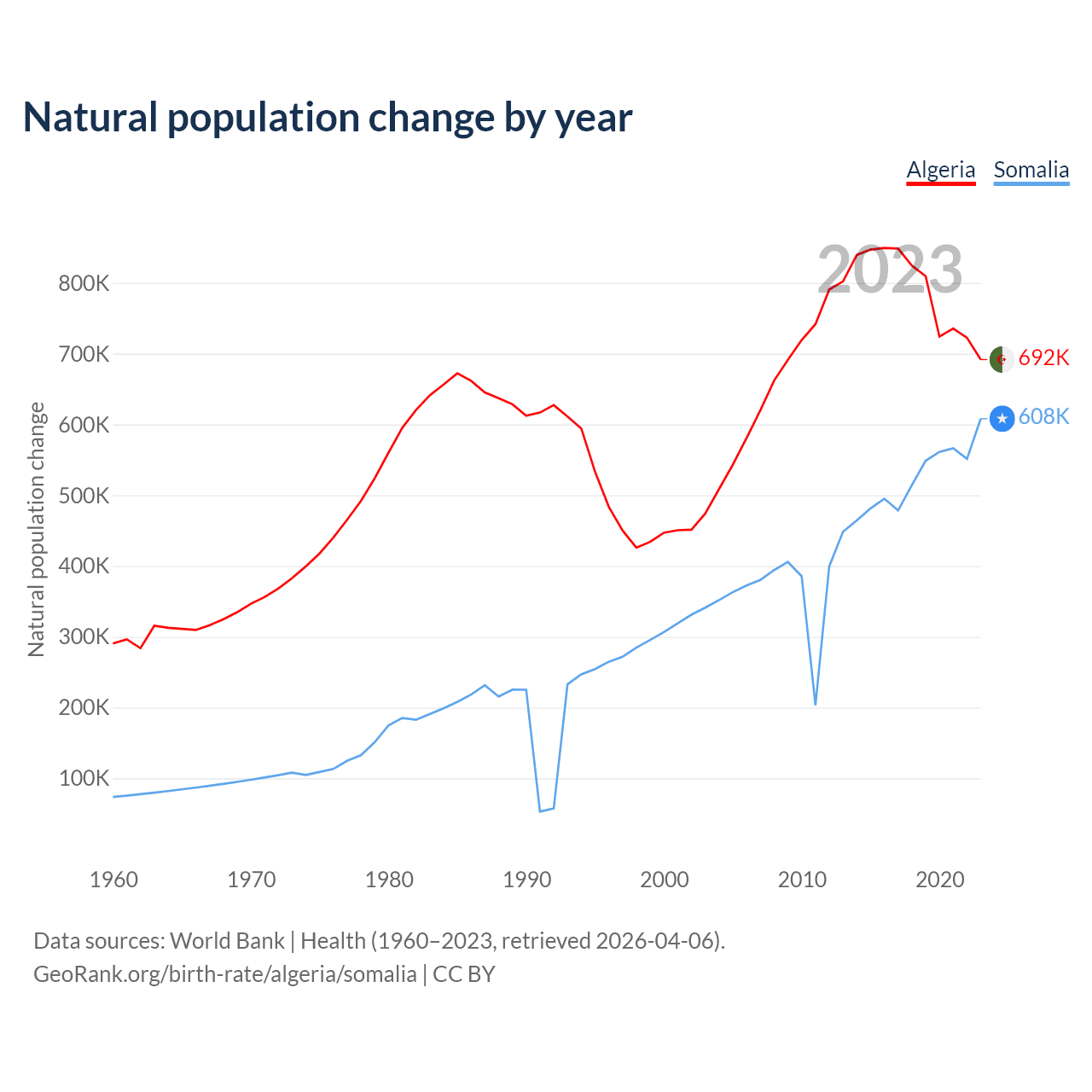 Algeria has an annual birth rate of 19.6 births per 1,000 people, compared to 43 for Somalia. The average number of children a woman is expected to have during her lifetime — the fertility rate, is 2.77 in Algeria and 6.13 in Somalia — 121.7% difference.