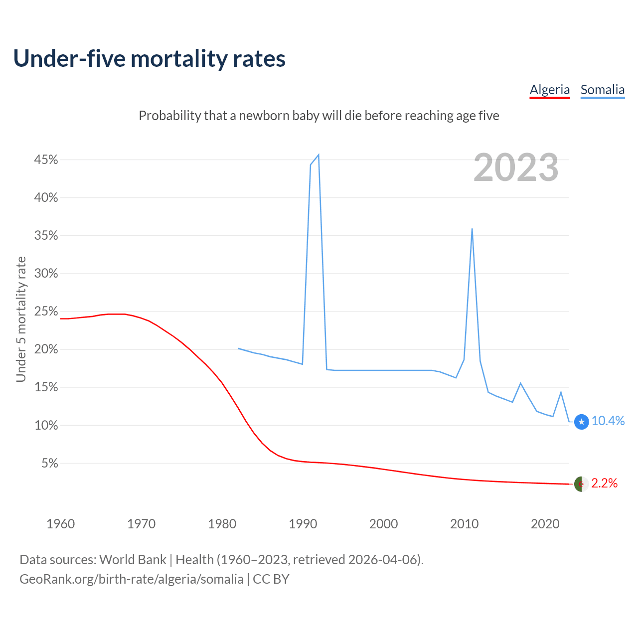 The chance that a newborn baby will die before reaching age five is 2.2% in Algeria and 10.4% in Somalia. Above is a chart with historical data on under-five mortality rates.