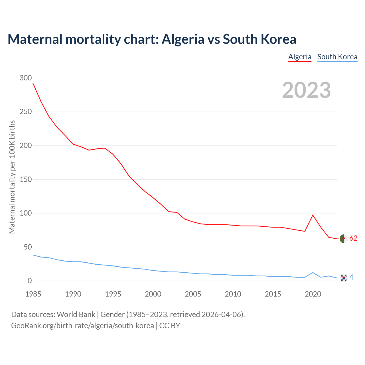 The maternal mortality rate, which is the probability of dying during childbirth or within 42 days of pregnancy termination, is 62 deaths per 100,000 live births in Algeria, compared to 4 deaths in South Korea.