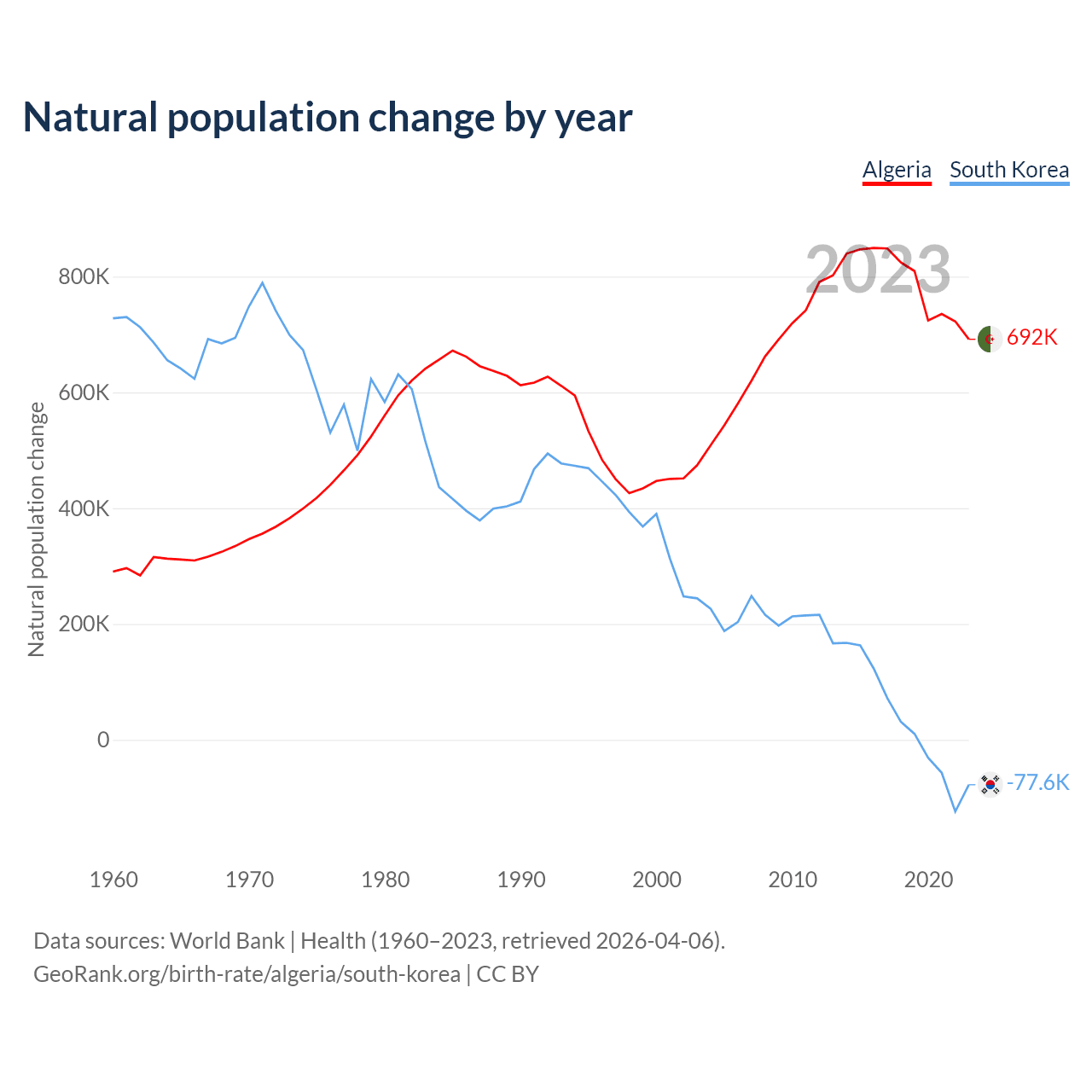 According to the latest available data on birth rates, the fertility rate in Algeria was 2.77 children per woman in 2023, compared to 0.72 in South Korea in 2023. The replacement level is considered to be 2.1 children per woman.