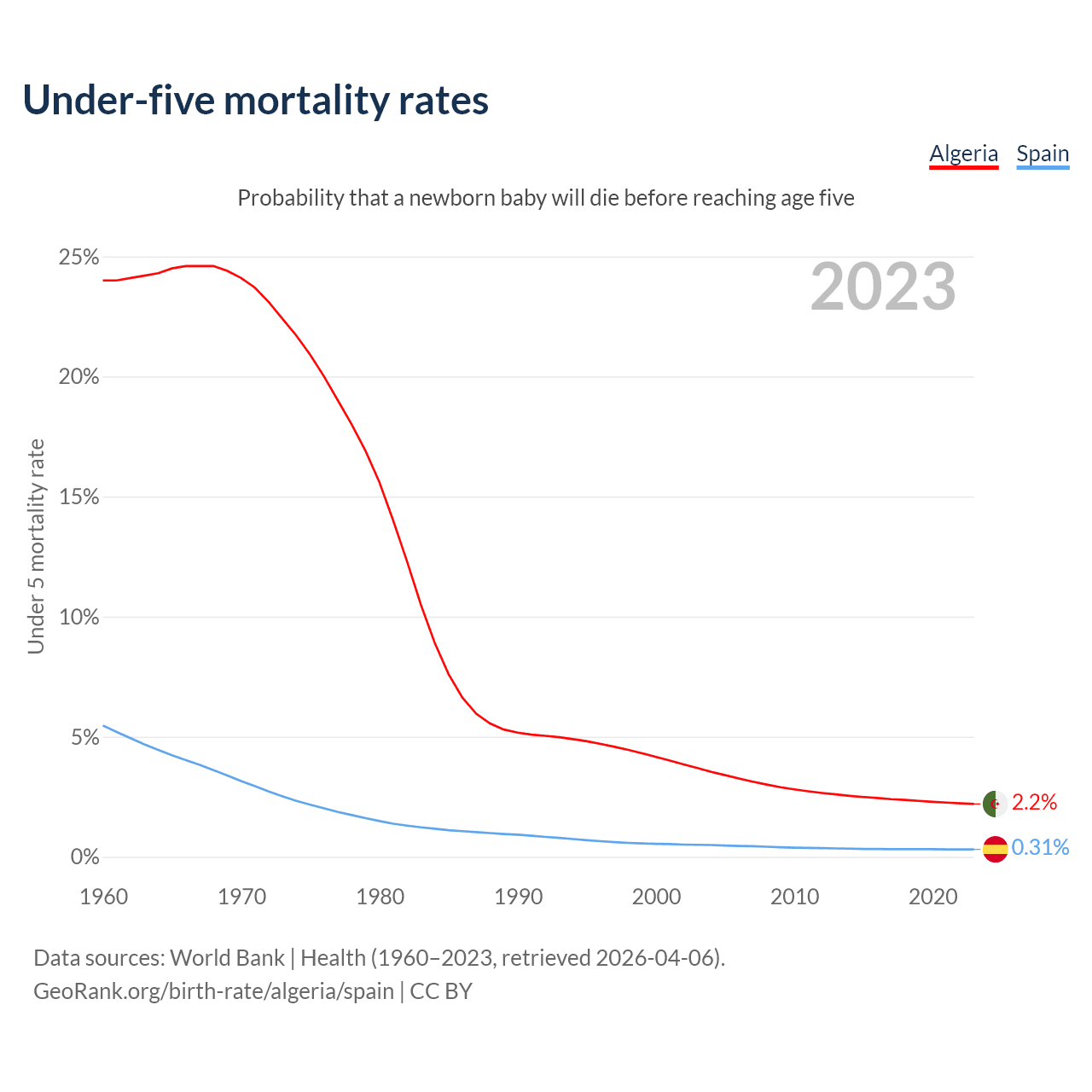 The chance that a newborn baby will die before reaching age five is 2.2% in Algeria and 0.31% in Spain. Above is a chart with historical data on under-five mortality rates.