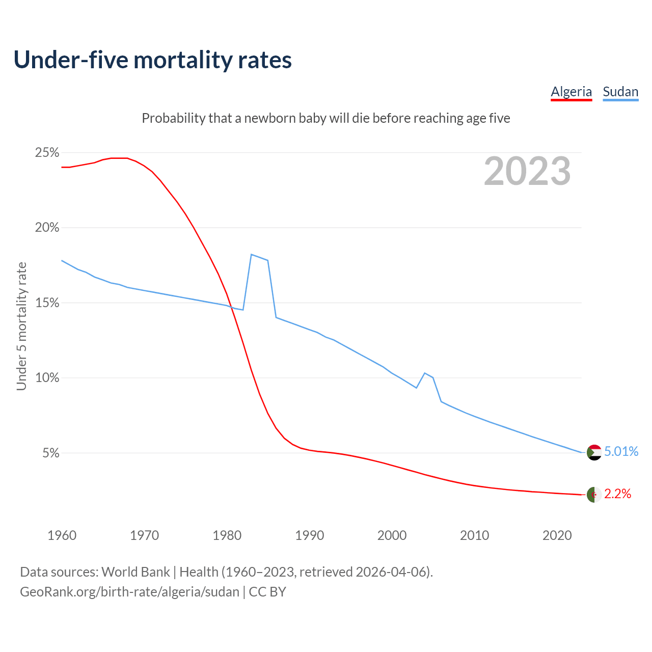 The chance that a newborn baby will die before reaching age five is 2.2% in Algeria and 5.01% in Sudan. Above is a chart with historical data on under-five mortality rates.
