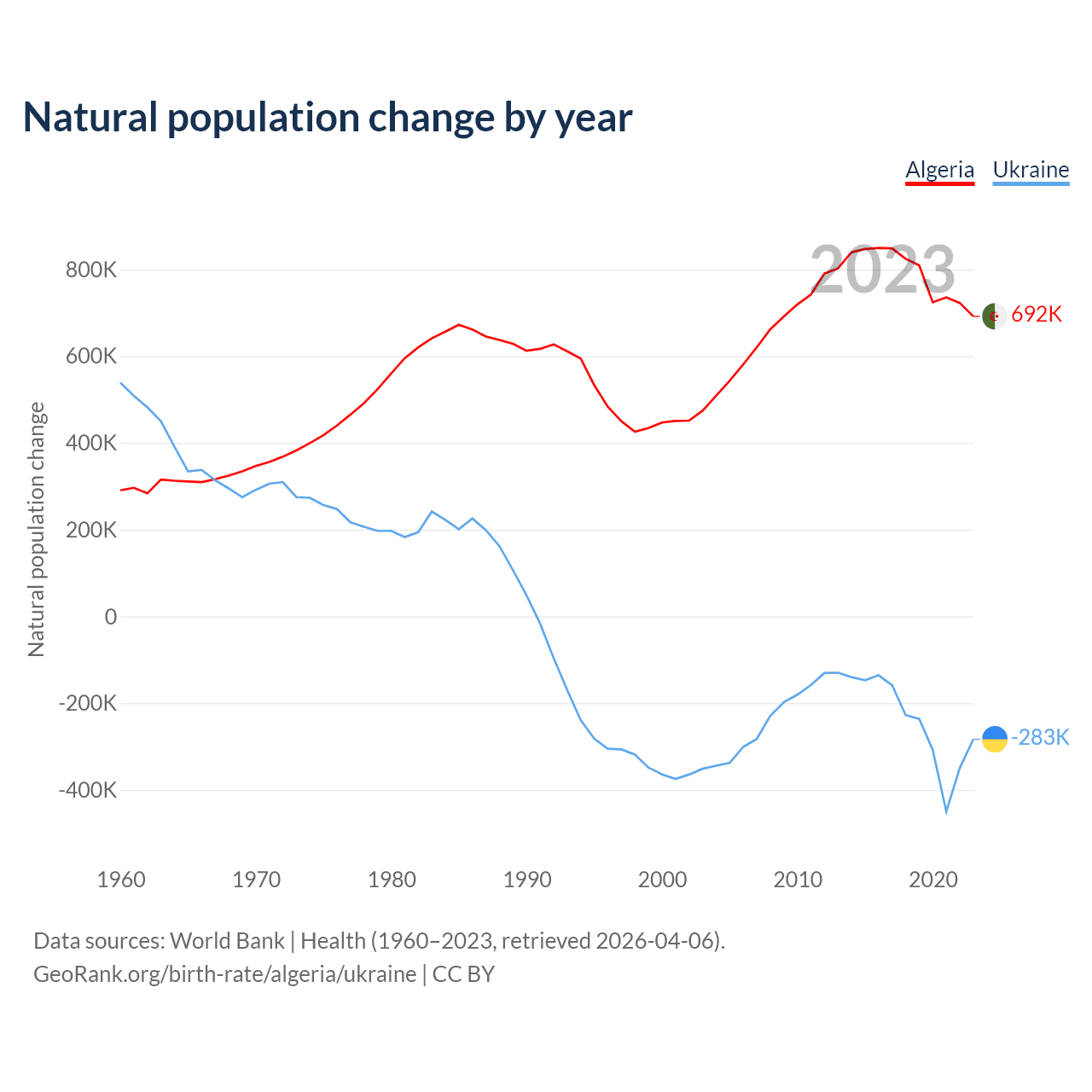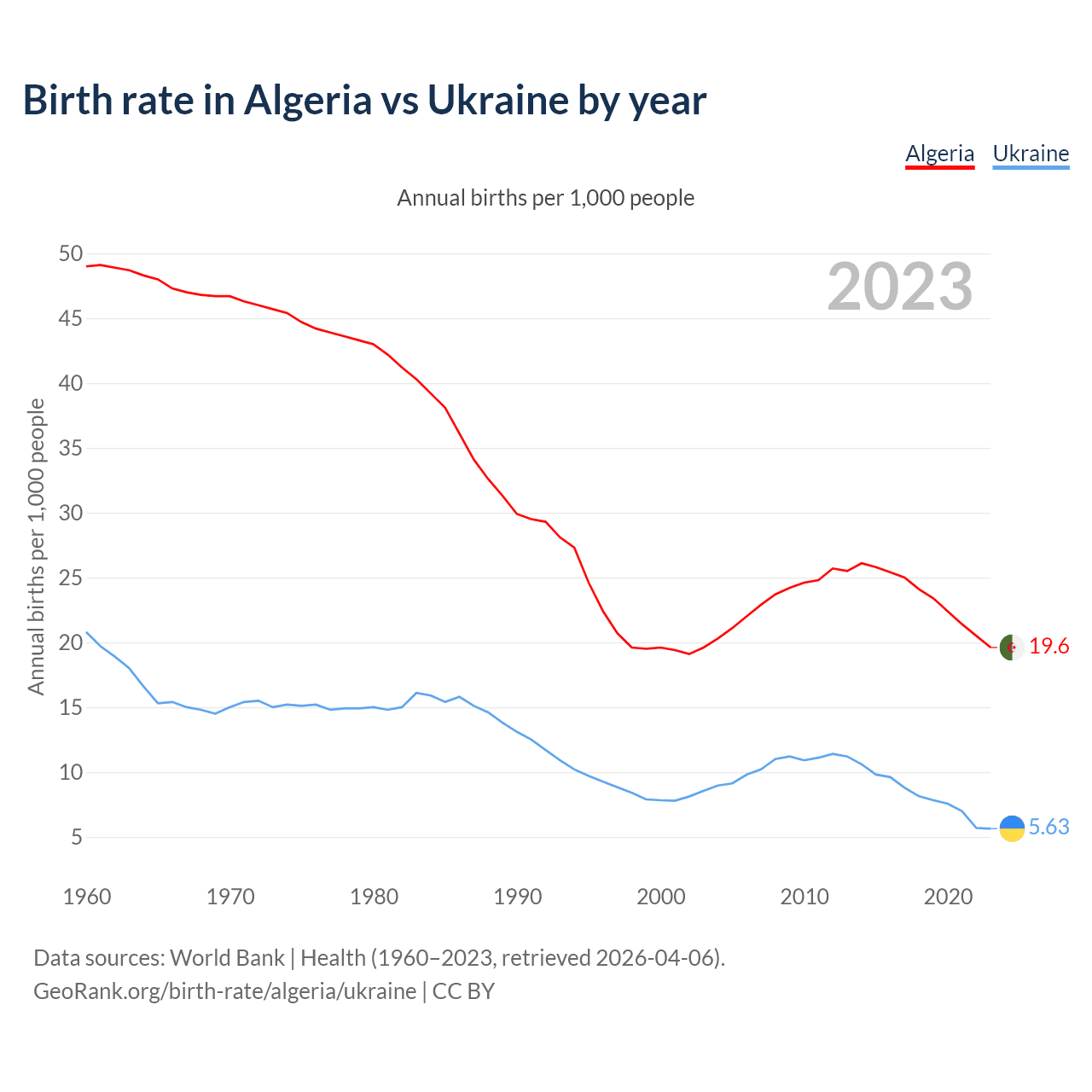 Algeria has an annual birth rate of 19.6 births per 1,000 people, compared to 5.63 for Ukraine. The average number of children a woman is expected to have during her lifetime — the fertility rate, is 2.77 in Algeria and 0.98 in Ukraine — 64.7% difference.