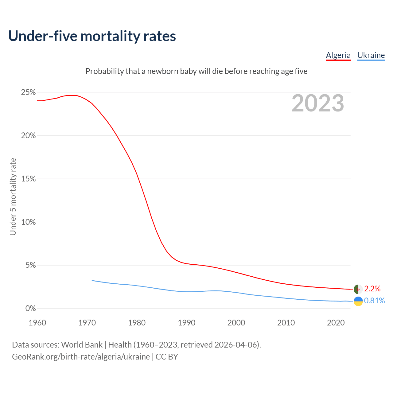 The chance that a newborn baby will die before reaching age five is 2.2% in Algeria and 0.81% in Ukraine. Above is a chart with historical data on under-five mortality rates.