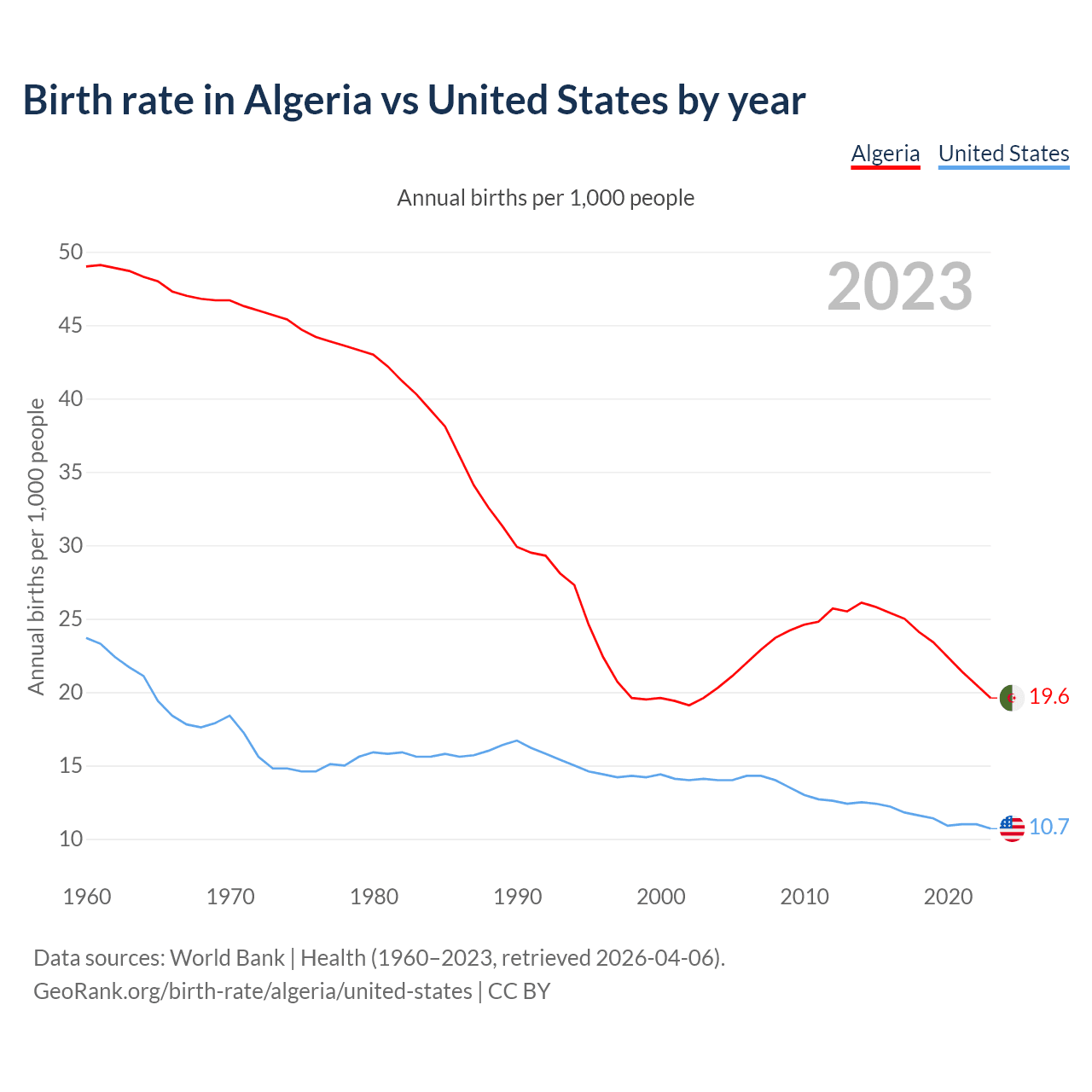 Algeria has an annual birth rate of 19.6 births per 1,000 people, compared to 10.7 for the United States. The average number of children a woman is expected to have during her lifetime — the fertility rate, is 2.77 in Algeria and 1.62 in the United States — 41.6% difference.