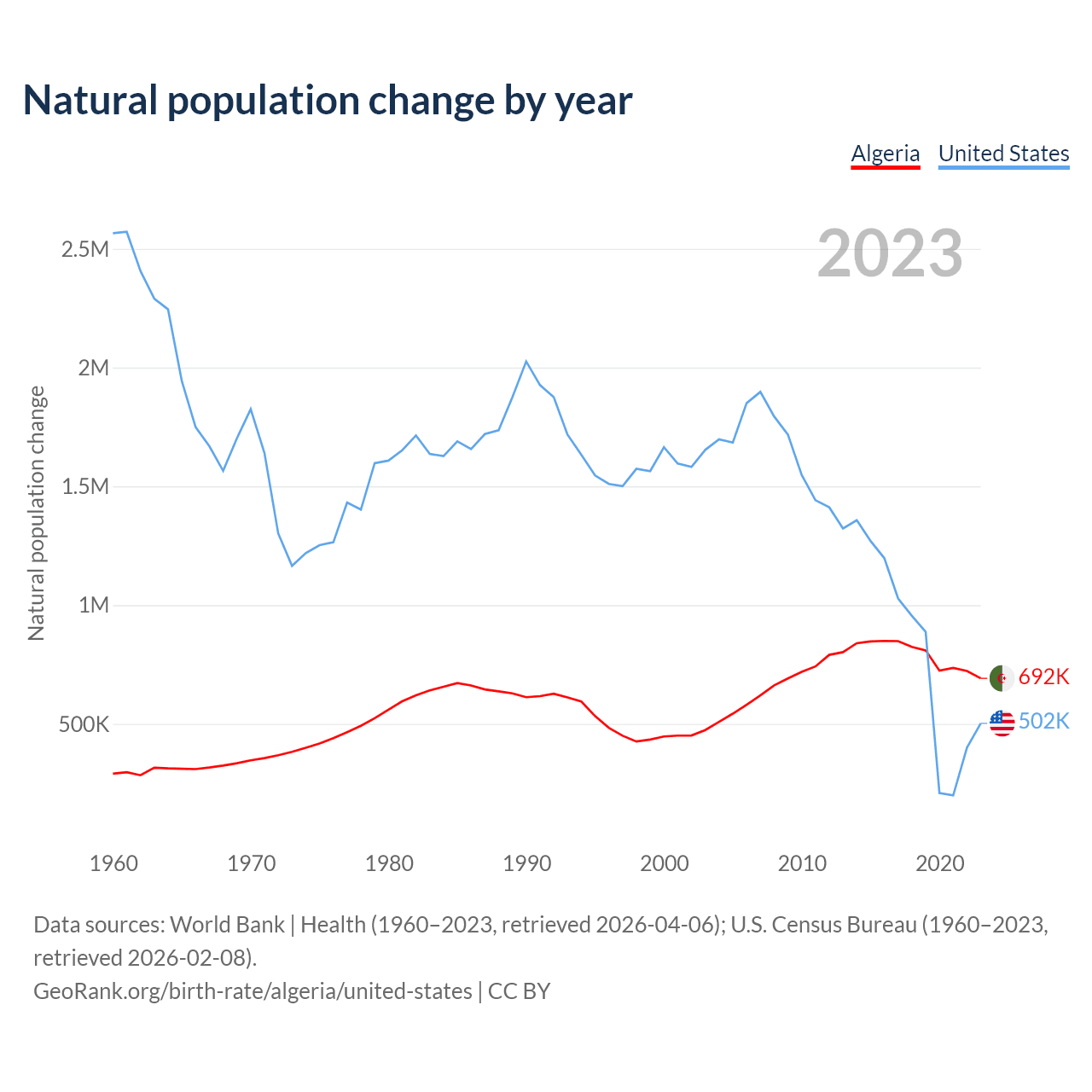 According to the latest available data on birth rates, the fertility rate in Algeria was 2.77 children per woman in 2023, compared to 1.62 in the United States in 2023. The replacement level is considered to be 2.1 children per woman.