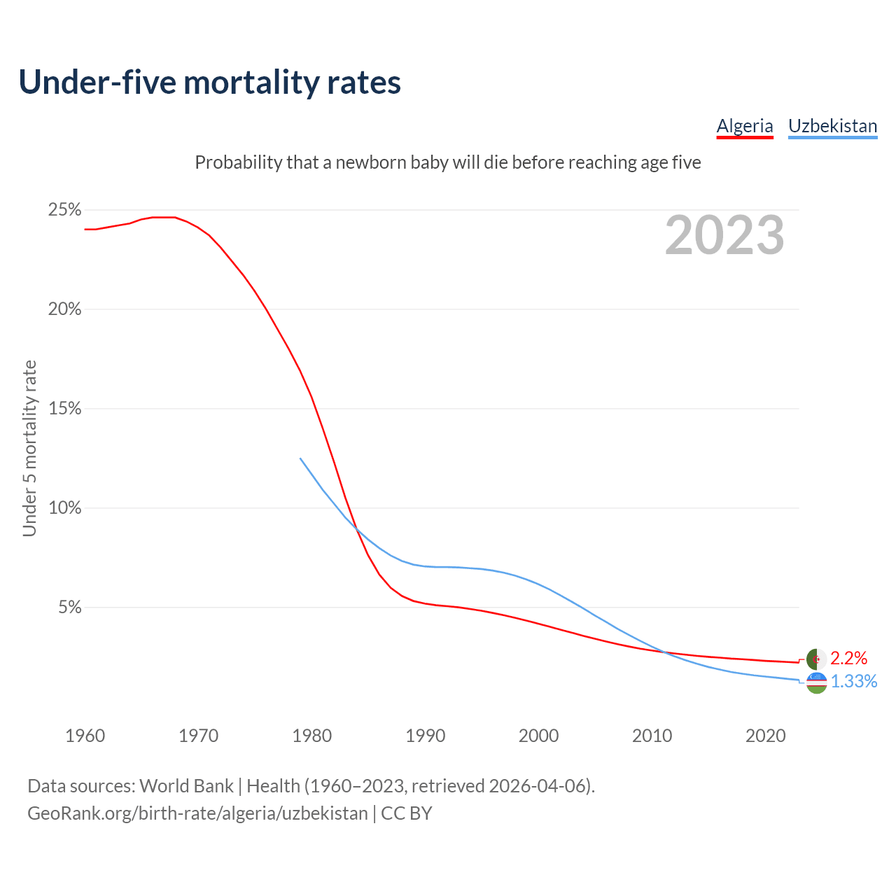The chance that a newborn baby will die before reaching age five is 2.2% in Algeria and 1.33% in Uzbekistan. Above is a chart with historical data on under-five mortality rates.