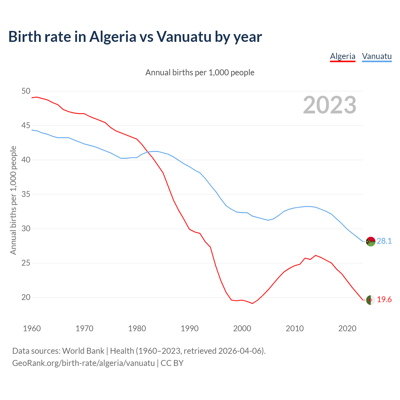 Algeria has an annual birth rate of 19.6 births per 1,000 people, compared to 28.1 for Vanuatu. The average number of children a woman is expected to have during her lifetime — the fertility rate, is 2.77 in Algeria and 3.6 in Vanuatu — 30% difference.